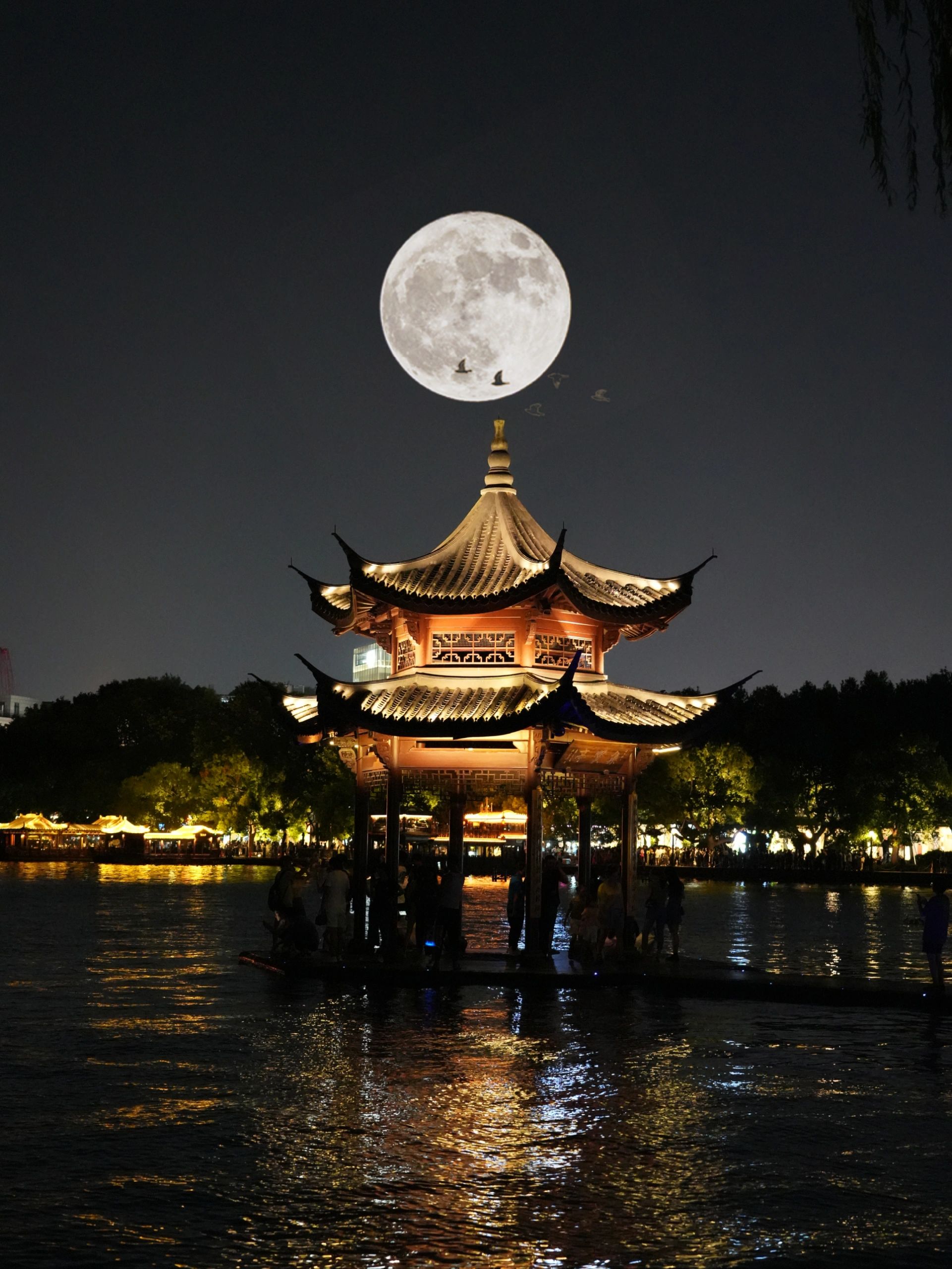 一轮圆月从东方升起,和挂在雷峰塔的月亮相对成双时,所谓的春花秋月莫过于此吧