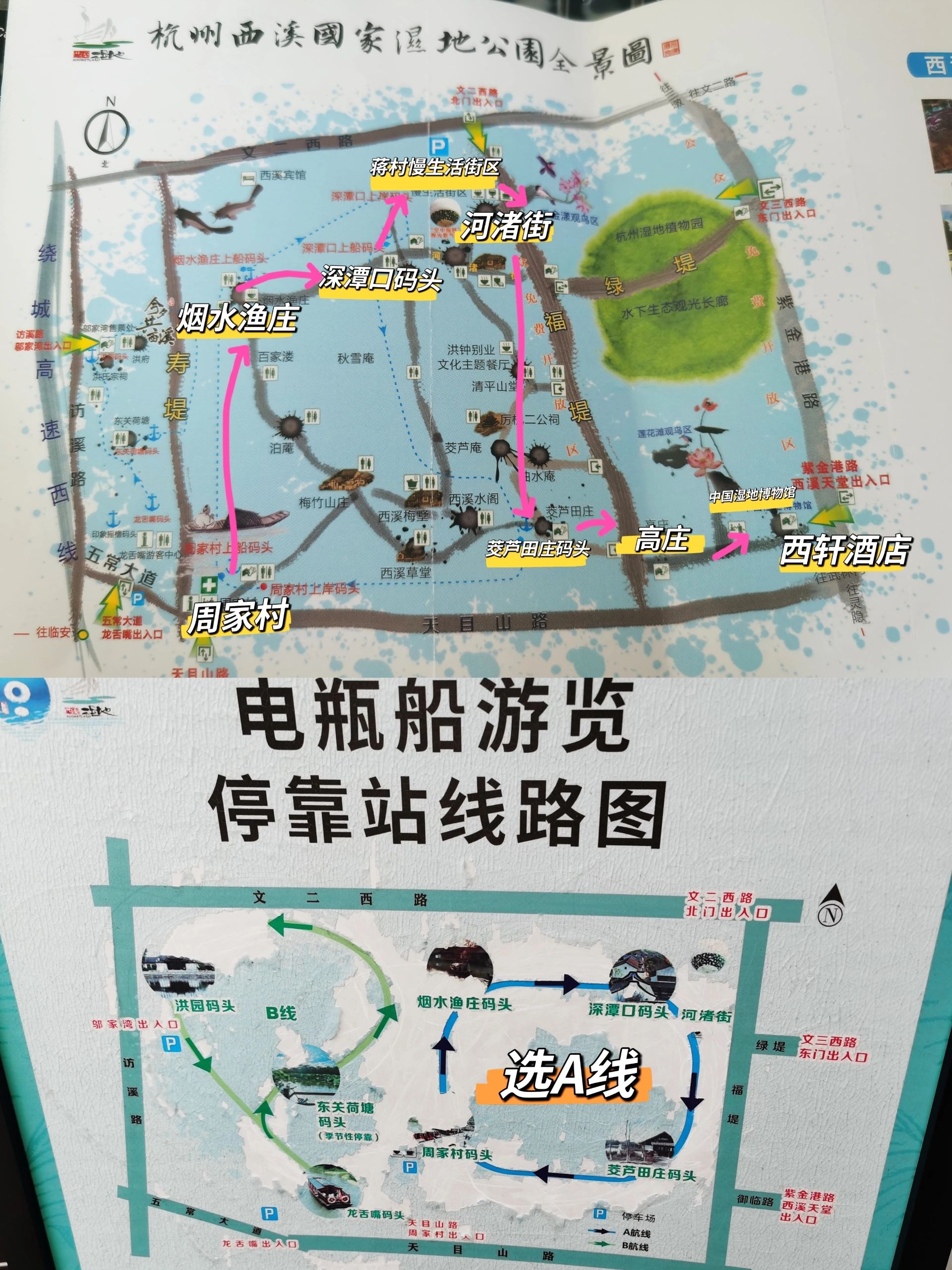 西溪湿地周家村入口坐电瓶船-烟水渔庄-深潭口码头-茭庐田庄码头-蒋村慢生活街区-河渚街-高庄-西溪天堂