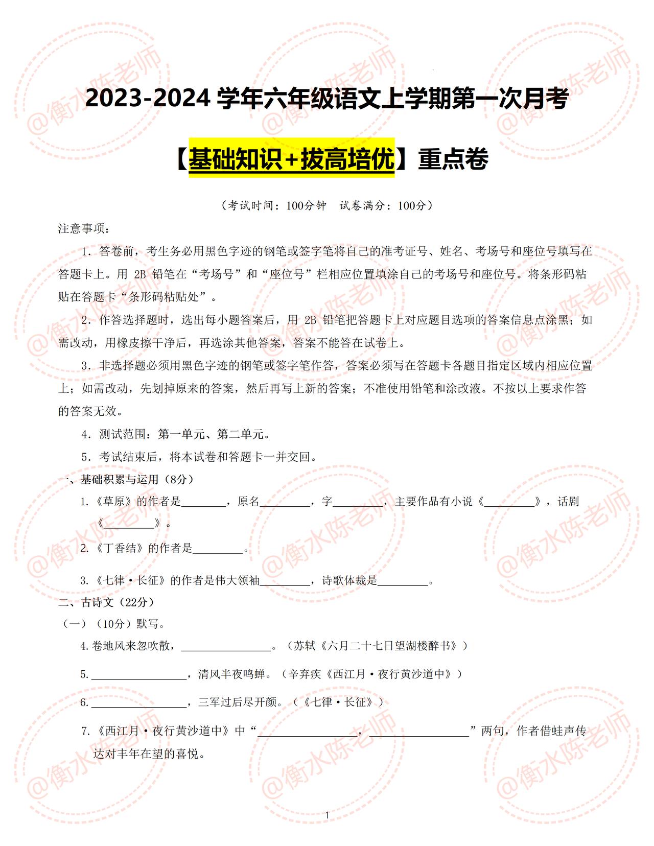 六年级上册语文,国庆节开学考试必出重点考题,提前发给同学们,月考试卷根据不同的城市、学校编写的热点考题,成绩差,想要考入到班级前三名,95分以上,记得找我沟通你们当地的月考试卷哦,想要获取的,跟我沟通联系哦。
