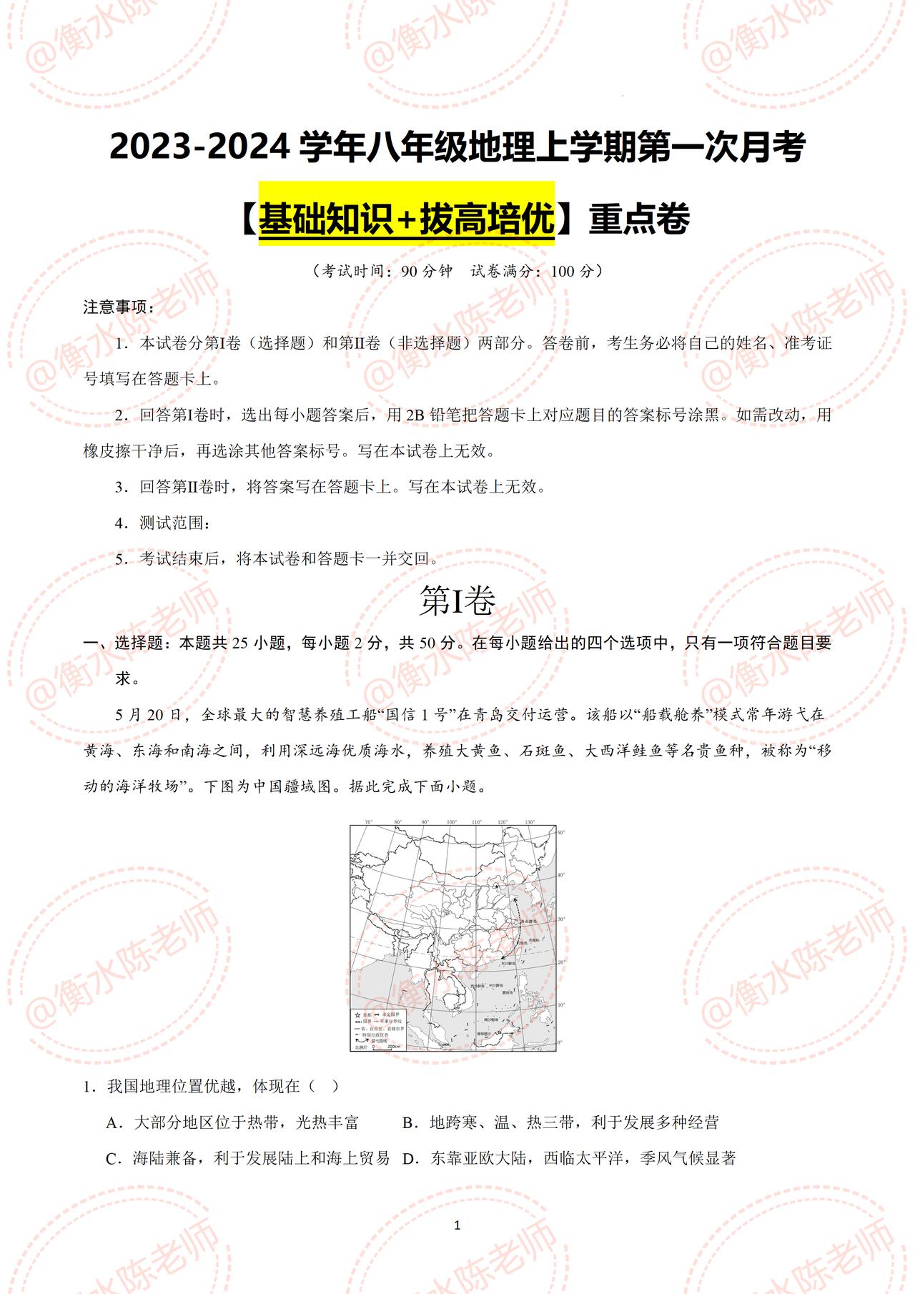 八年级上学期地理,10月1日过后,开学考试重点考题,地理成绩比较弱,基础比较差的,考前一定要认真做完,你的地理成绩至少提高30分以上哦,地理月考试卷,是根据不同的城市、学校、版本编写的,想要获得好成绩,记得做一遍自己城市月考试卷哦,想要获取的考生,跟我沟通和联系哦。