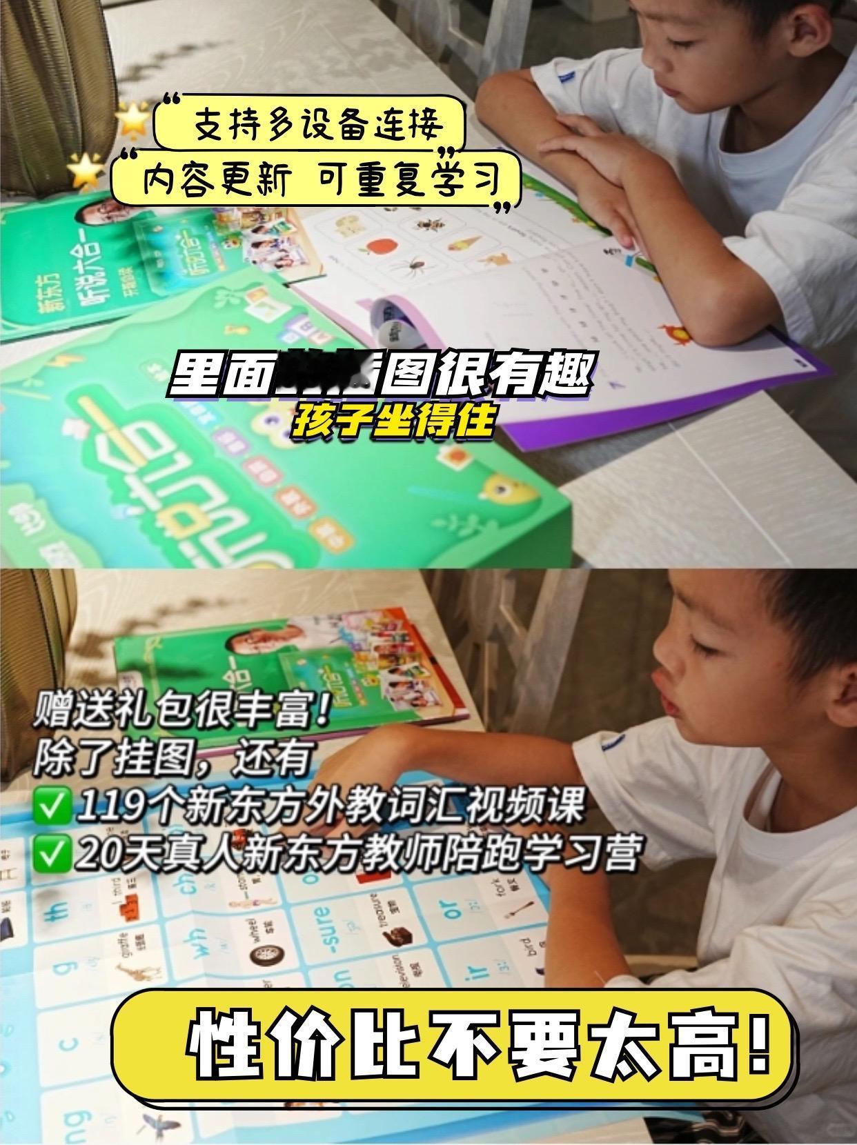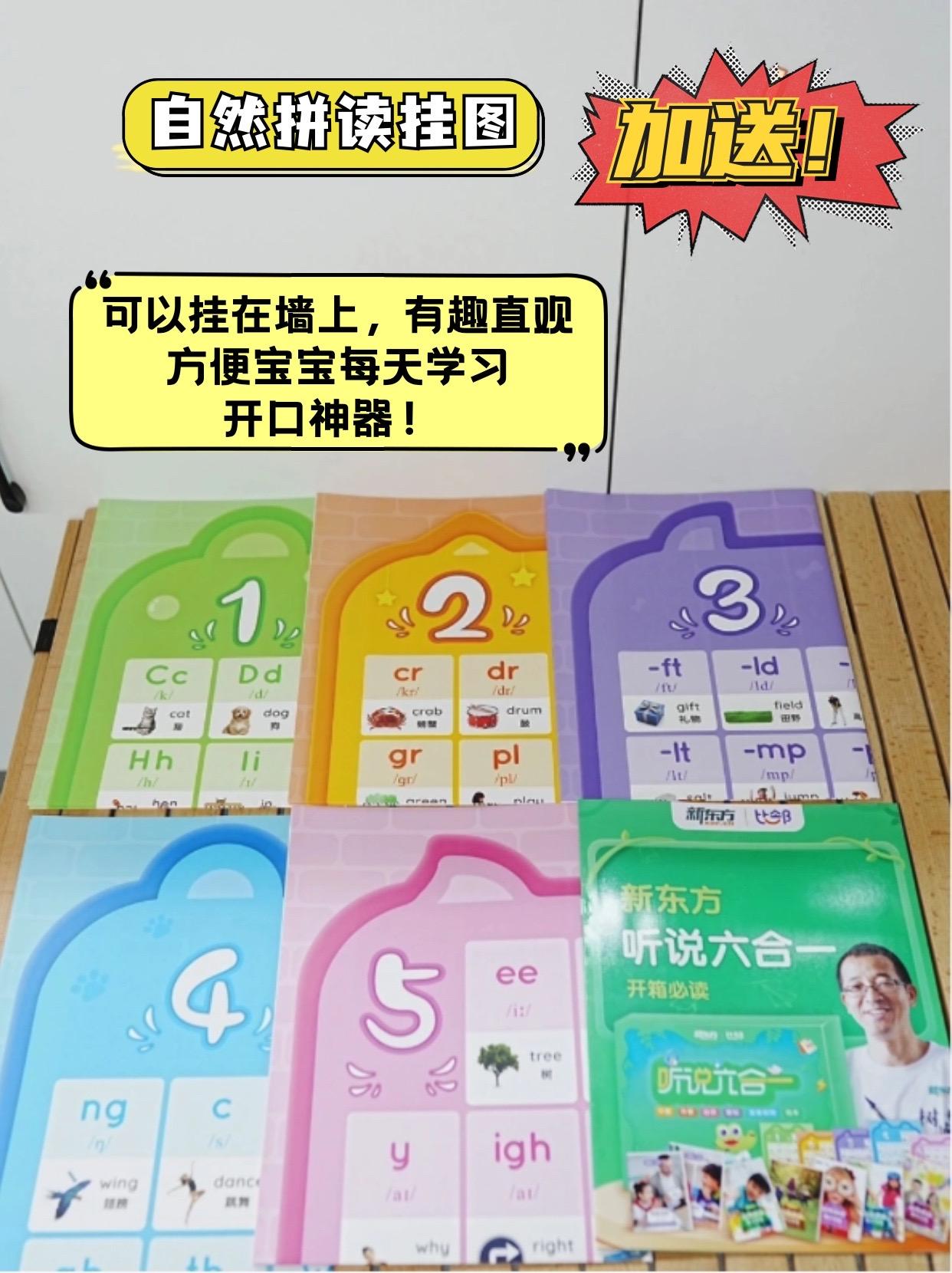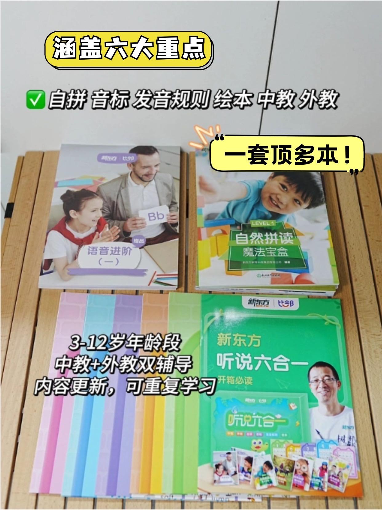 0基础带娃英语启蒙~英语渣妈有救啦!孩子英语基础薄弱,工作忙没时间辅导/英语渣? 想把新东方自主研发的听说六合一宝盒安利给全世界!! 不愧是俞老师推荐的~ 点一点,翻一翻,孩子就能跟着开口说英语~ 还不费妈,推荐给所有麻麻们!!可以跟着孩子一起提升! 先说下亮点吧 中教+外教相结合,中教讲解知识难点,外教一对一示范地道语言,非常适合中国宝宝的体质~ 里面包含的资源很丰富,自然拼读、精读绘本、音标精讲、语音规则,听说写全掌握!可以说很全面了 有趣味动画、韵律童谣结合,孩子一坐就是1h,感兴趣 自然拼读为单词而生,单词是英语科目所有组成基础,学习完可掌握84%的自拼词汇! 国际音标,解决了20%的长难单词,能够自信地道的说英语 内容永久有效更新,可重复学习,3-12岁年龄段都能用!家长也可以跟着一起学习哦 有专属app,还支持多台设备登录和投屏~ 这套“新东方六合一宝盒”覆盖—— 自拼 音标 发音规则 绘本 中教 外教 包含资源: ✔3大课程:自然拼读 国际音标 发音规则 150节自然拼读AI互动课 48节国际音标AI互动课 12节发音规则AI互动课 ✔2种师资:中教 外教 两名新东方中教共同授课。全面解析发音与拼读规则 两名新东方外教一起伴学。讲解小学必备词汇、带读国际音标发音 ✔1套绘本: 45本 45本自然拼读精读绘本(电子版) 45个趣配音活动 点击下方购买,还加送:(不管,就是宠粉!) 5张自然拼读知识点挂图(配套118个外教带读视频) 119个新东方外教词汇视频课 20天真人新东方教师陪跑学习营 而且售后很贴心哦,支持7天无理由退换,48h发货~ 快快把六合一宝盒带回家,让孩子开启全新英语学习新世界吧! 关注我,不定期更新英语干货及宠粉福利!