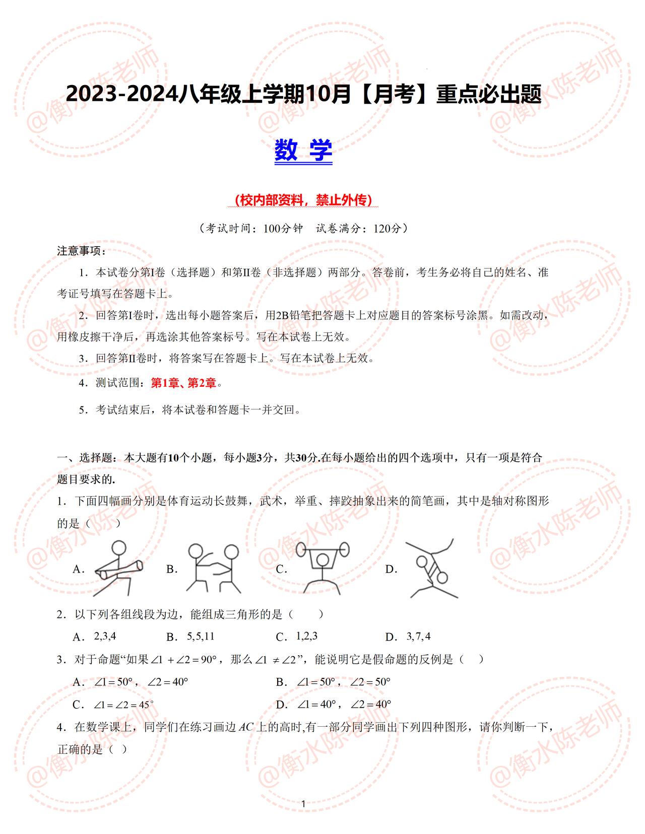 国庆节马上结束了,不知道同学们复习的怎么样了,老师提前把名校名师编写的,八年级上册数学,按照不同的城市、版本、学校编写的重点考题发给同学们,数学成绩差的,临考之前一定要做一遍,全是重点必出考题,要做自己城市对应的考题,想要获取的考生,赶紧和我沟通联系吧,考试让你少走很多弯路哦,让你考试中多挣分数哦。