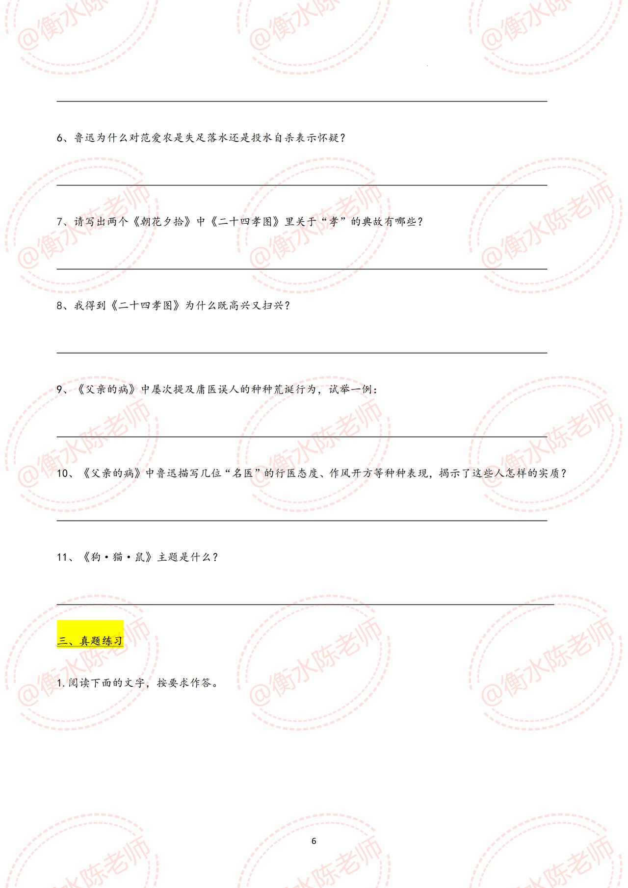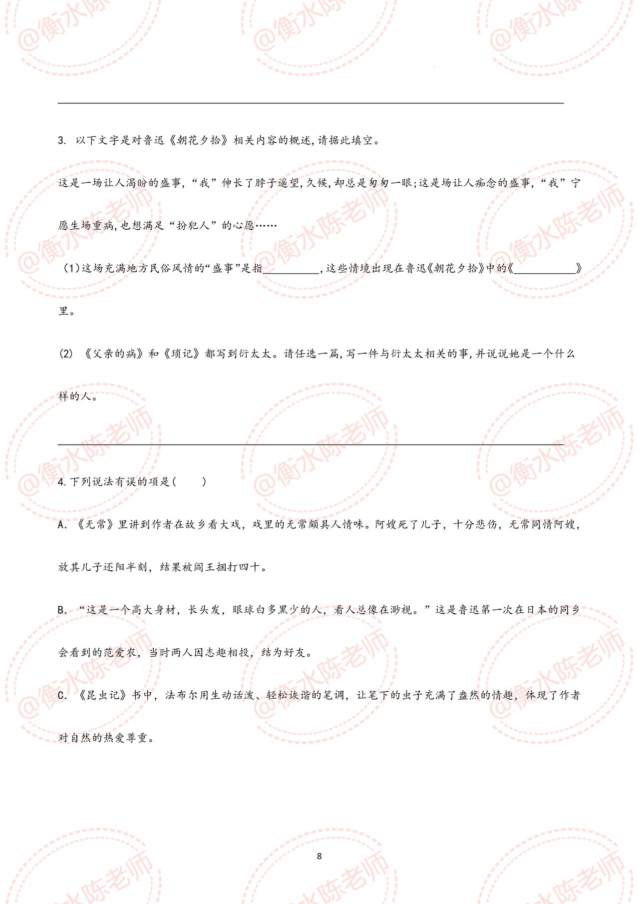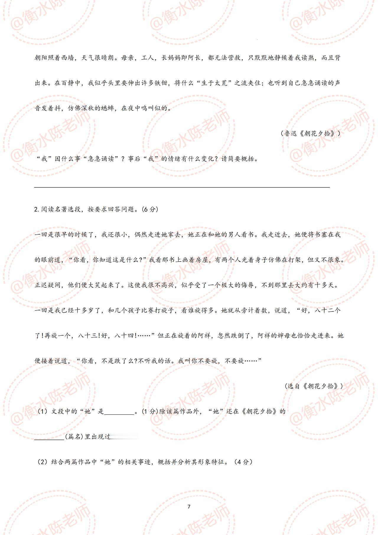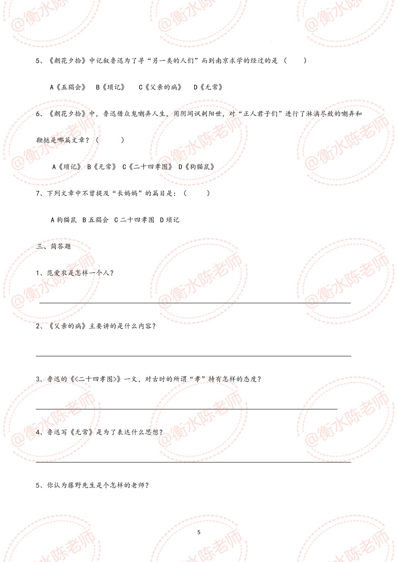 七年级上册语文,国庆开学考试,名著阅读《朝花夕拾》重点考试题型【划重点】,这些题型,全是考试中经常出现的,吃透这份资料,考试中让你少走很多的弯路,甚至考试不扣1分,都是必出的重点题型,考前同学们认真做完,由于资料比较多,需要全部资料,和我保持沟通哦。