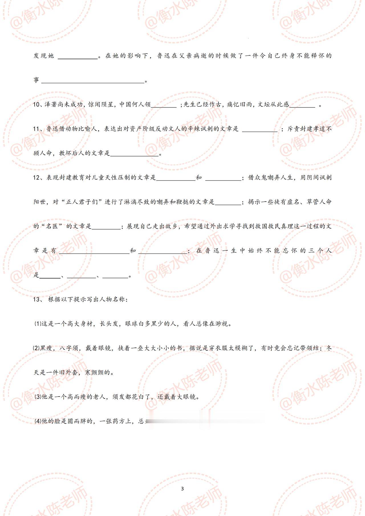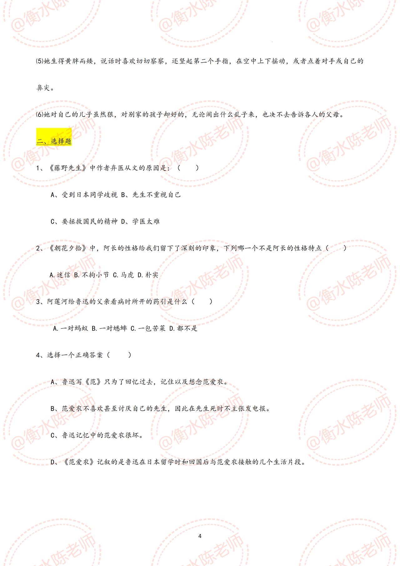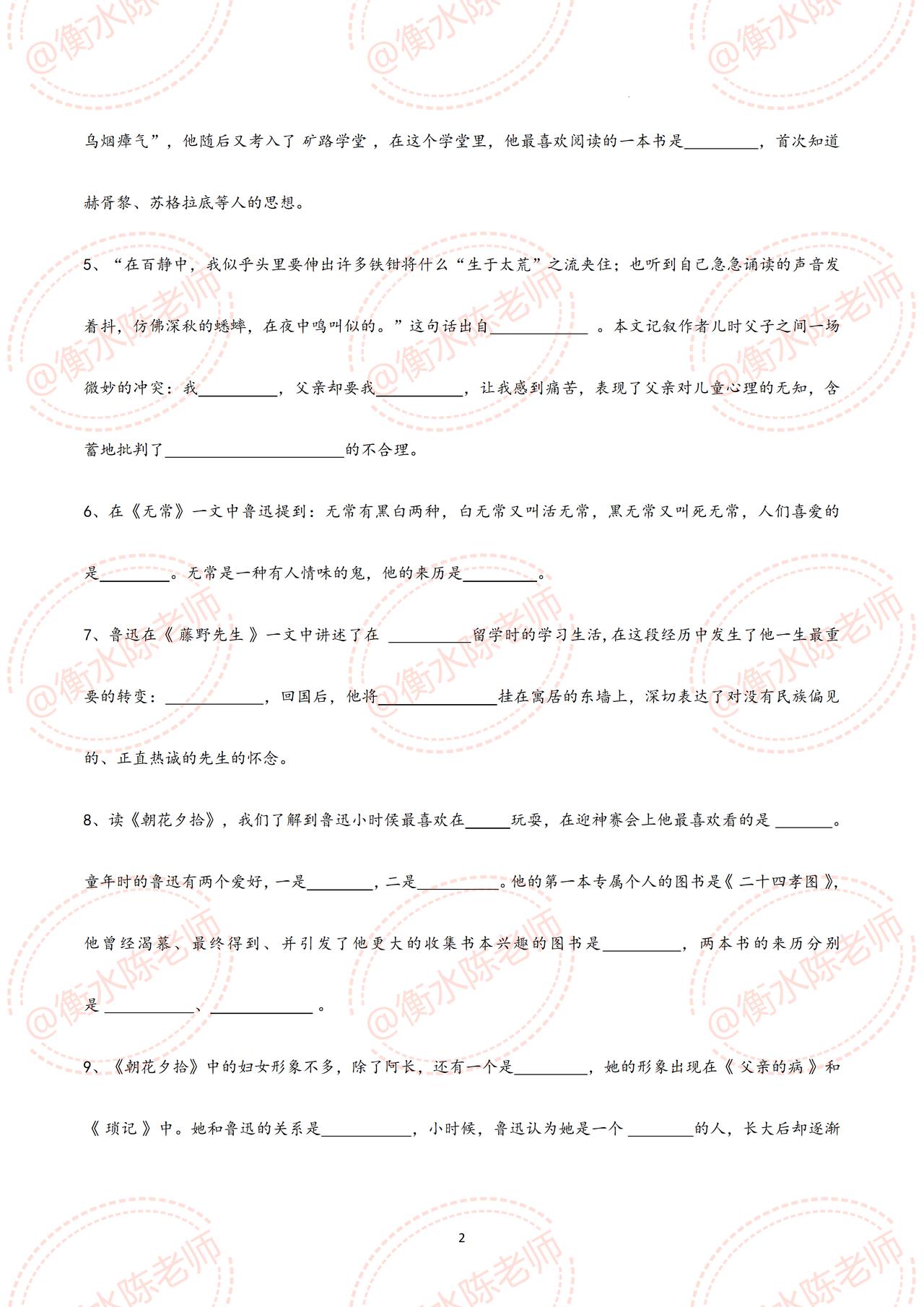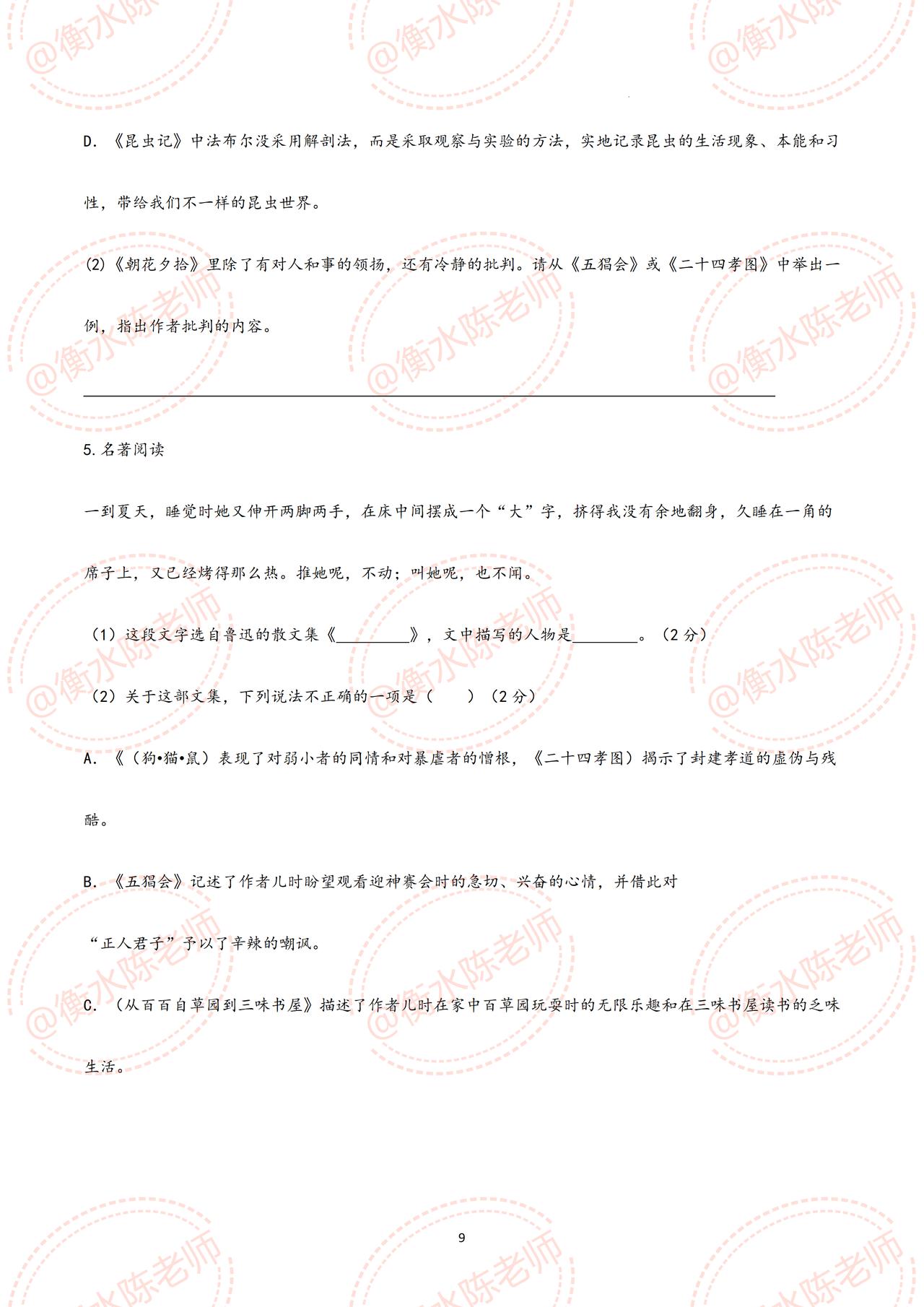 七年级上册语文,国庆开学考试,名著阅读《朝花夕拾》重点考试题型【划重点】,这些题型,全是考试中经常出现的,吃透这份资料,考试中让你少走很多的弯路,甚至考试不扣1分,都是必出的重点题型,考前同学们认真做完,由于资料比较多,需要全部资料,和我保持沟通哦。