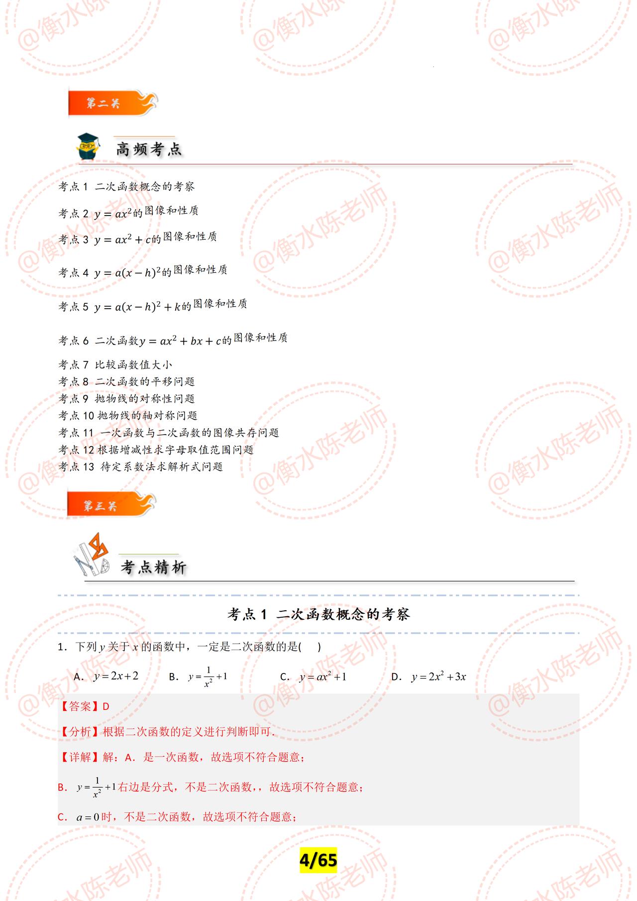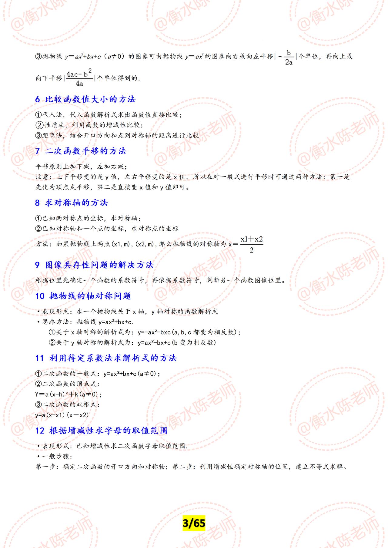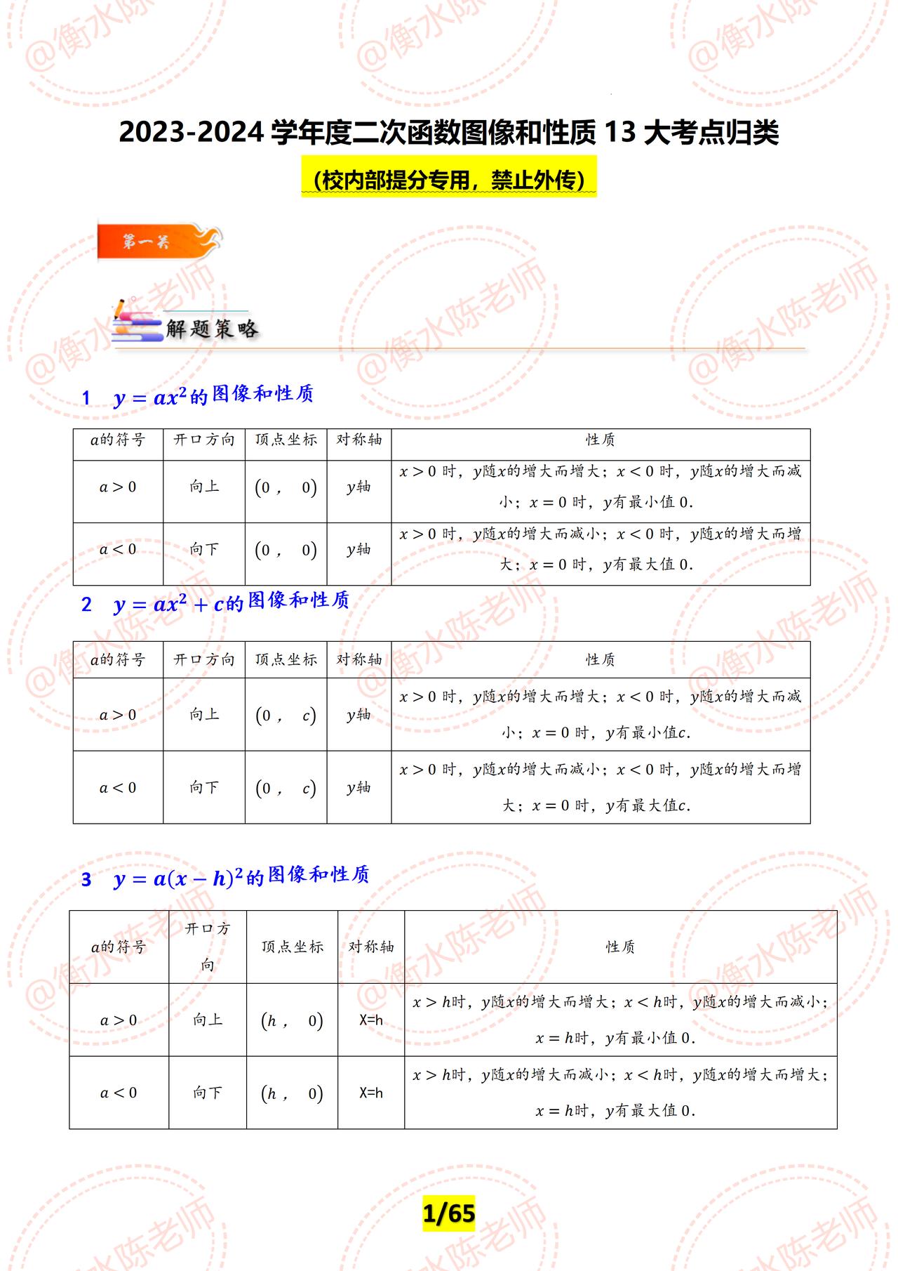 二次函数这个章节的内容,也是中考必考的内容,不仅分值占比高,难度上也大了一些,这部分没有学好的,老师把解题、提分方面的技巧和思路发给同学们,掌握这套方法,任何题型不用怕,分数白白送给你哦,这方面资料属于2024中考专题,内容比较多,只能发给大家一部分哦,需要全部资料的,记得和我沟通哦。
