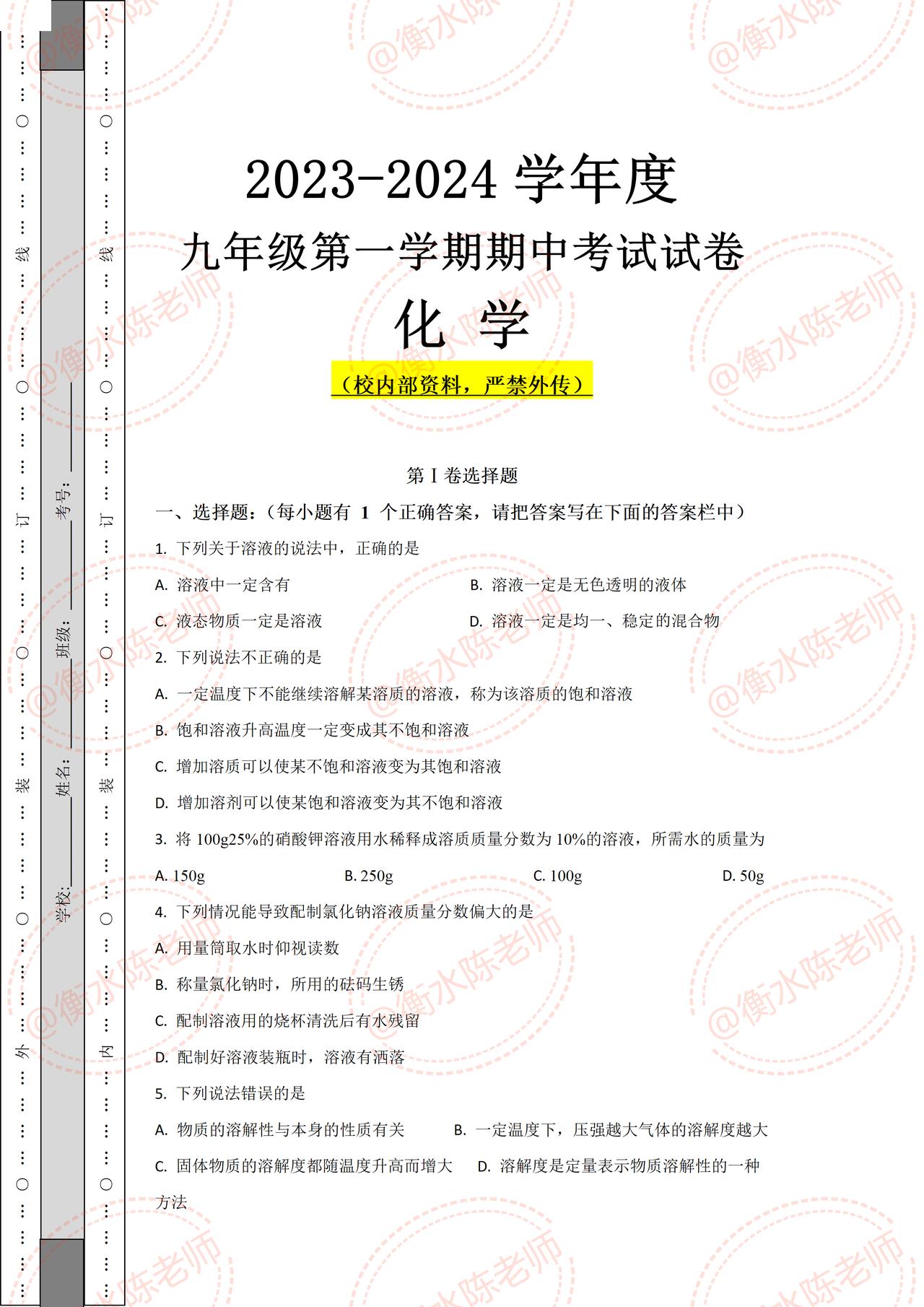 九年级第一学期化学,根据不同城市、学校、考试重点编写的期中考题试卷,提前发给大家一部分看一下,月考成绩不理想的考生,这次期中考试很关键,一定要考出好成绩,一鸣惊人哦。 我们的期中测试卷,根据不同的城市,学校考试范围编写的,期中考试想要获得好成绩,进到班级前三,记得找我做你们当地的期中考试卷哦。