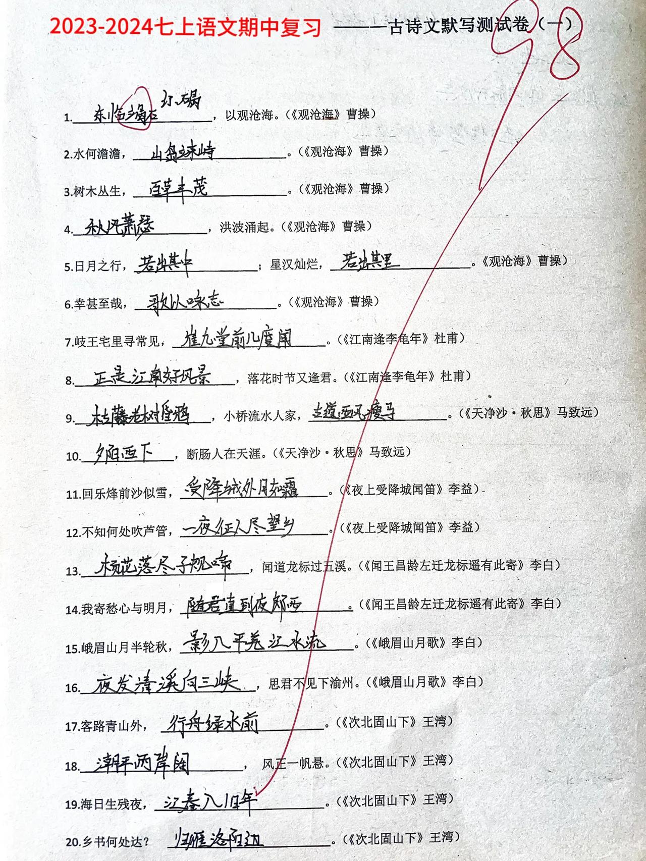 七年级上学期语文,期中考试【古诗文默写】,常考热点题型,每天背诵一遍,不仅背的熟练,同时也要把错别字,易错字默写一遍,只有这样双管齐下,你才能考试中不失分,不扣分。 七上语文古诗词默写考题,都是同学们考试中经常容易出错的题型,好好看一遍,提前把考试分数送给大家。