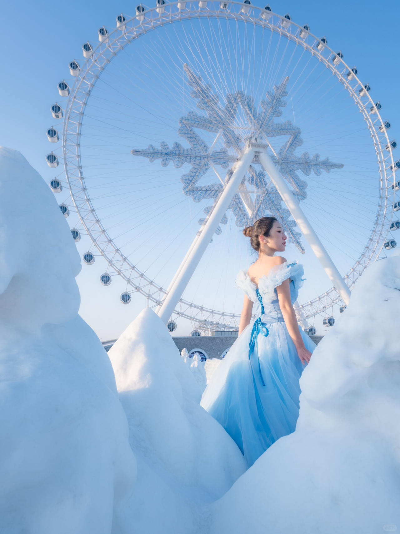 4⃣️摩天轮建议日落的时候去。这个时候夕阳洒下来泛起金色的光。可以选择在旁边的小雪堆上拍,这样可以很巧妙的避开摩天轮下的人潮