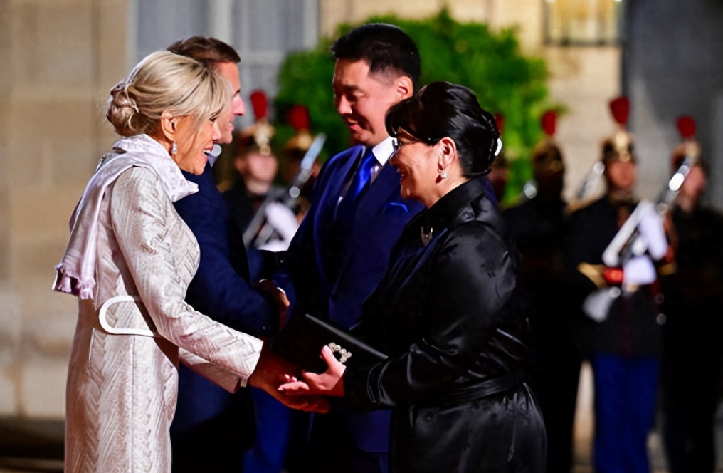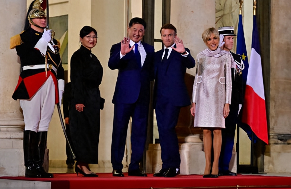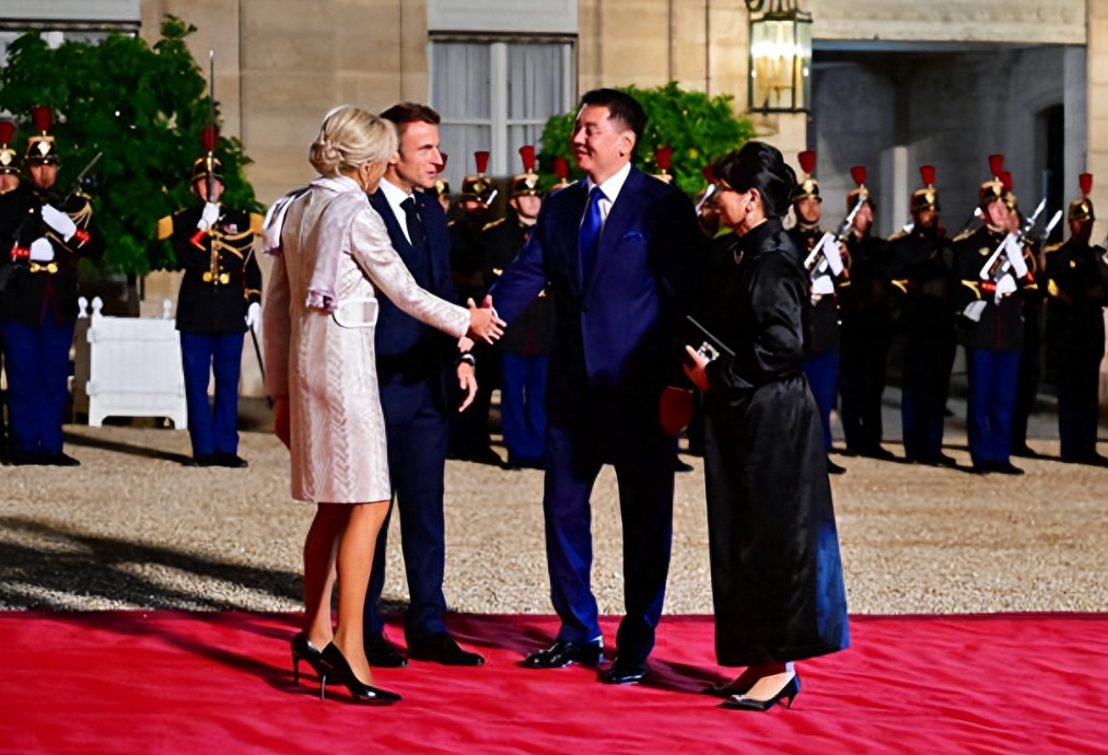 70岁法国第一夫人接待蒙古国第一夫人,穿紫色时装裙系着配套围巾,一身时髦打扮脚踩七八厘米的高跟鞋,气质出众又迷人,把贵宾都比下去了,这魅力也太大了;还有小24岁老公穿着蓝色西服套装也尽显儒雅帅气,夫妻俩都打扮年轻,让人看不出年龄差了。