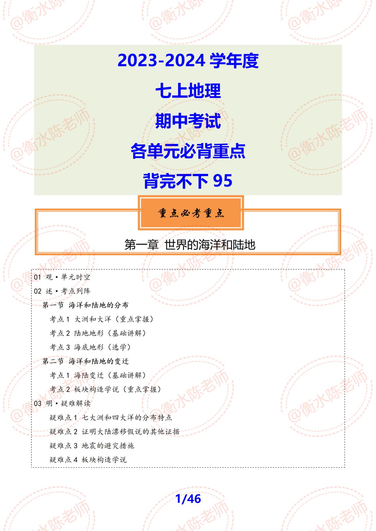 七年级上册地理,根据各个单元编写的必背重点,成绩差的,考前认真背一遍,让你多考30分以上,必背资料根据不同的城市、版本编写,想要获取的考生,记得看自己城市对应的资料,想要获取的考生,记得和我沟通联系哦。