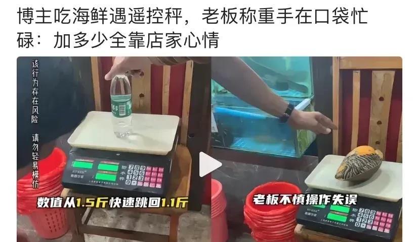 我很好奇,个个都被什么遥控秤给骗了,正常操作不是货还在秤上,出了重量以后加一瓶水上去吗?