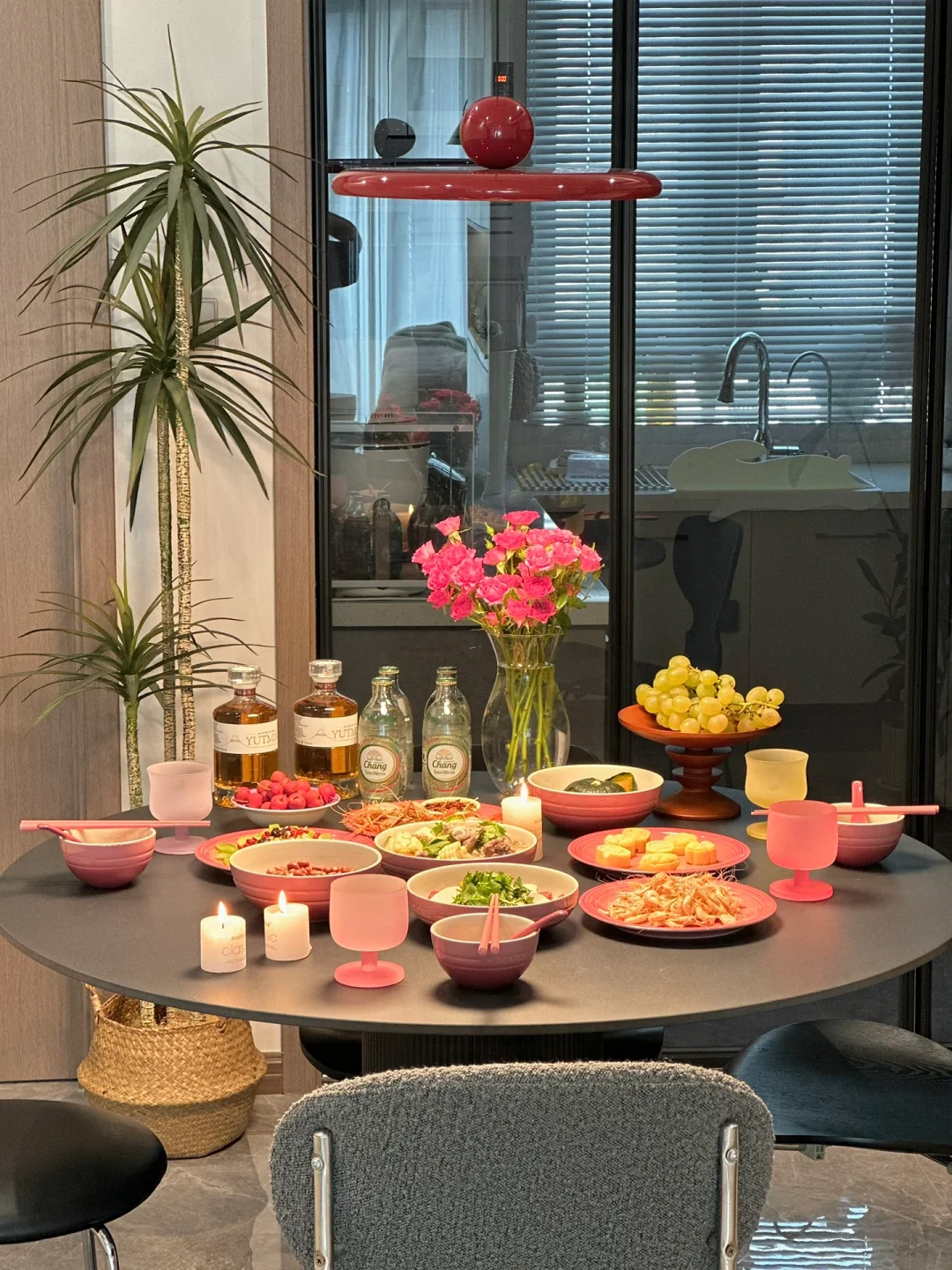 1.2米直径的黑色岩板餐桌,比较高级,平时坐4-8个人足够了