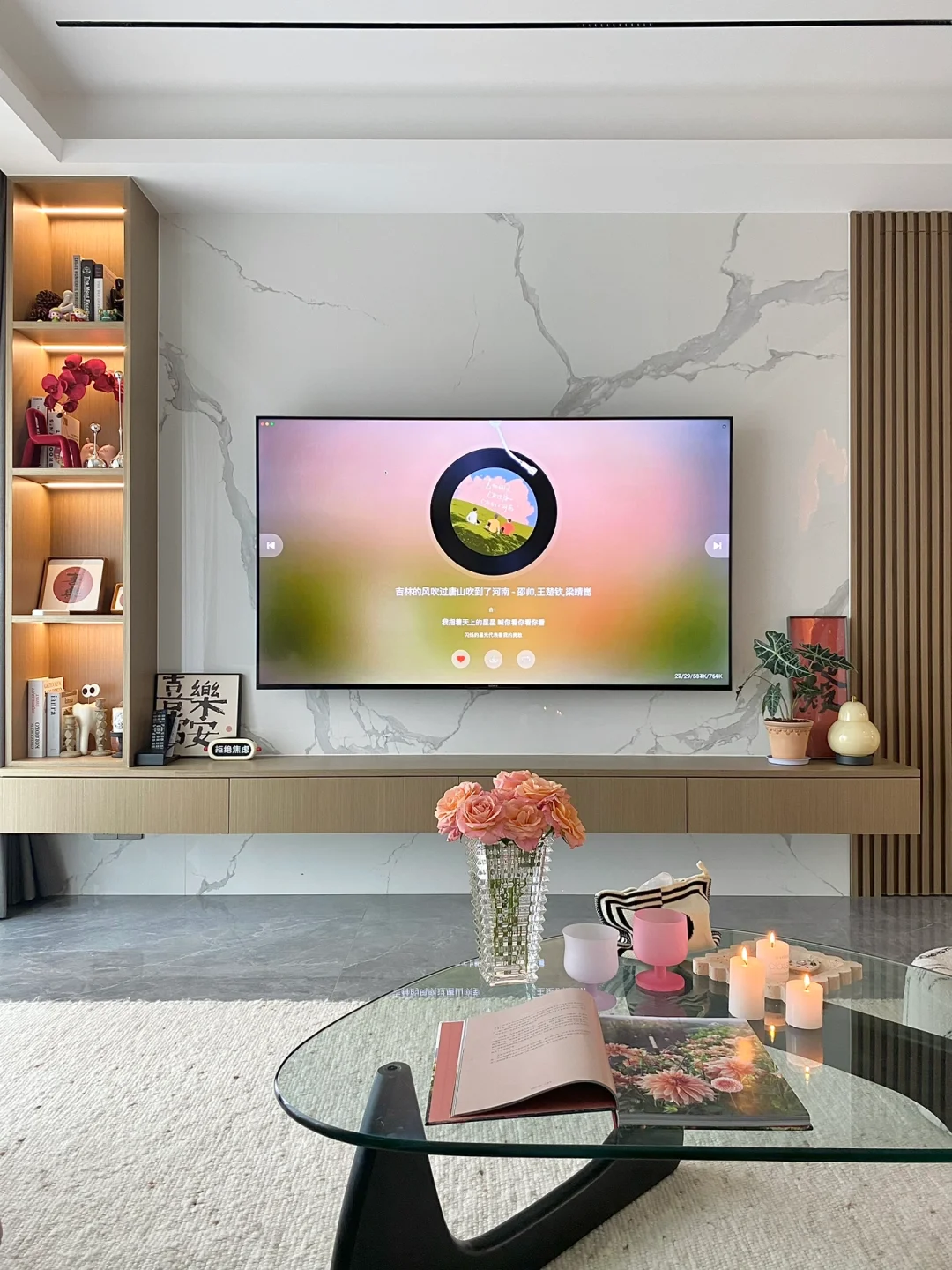 电视机背景墙是鱼肚白岩板平铺+木饰面悬空电视机柜,左边坐了木格栅隐形门