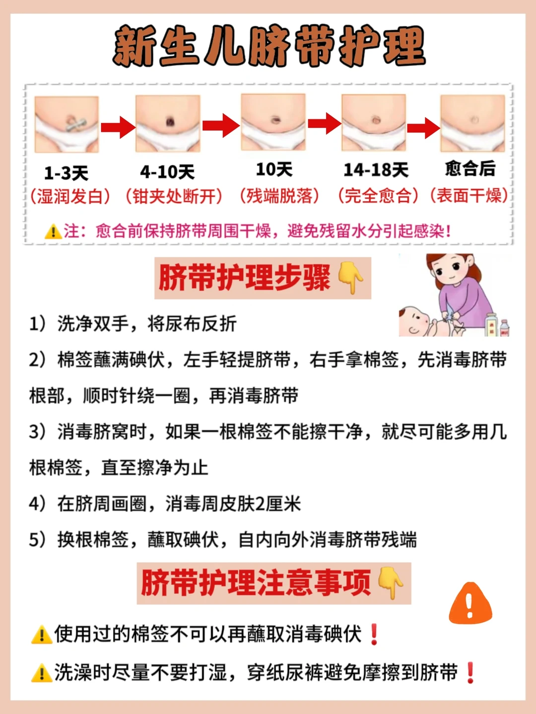 🌙2、脐带脱落一般需要7-10天,有可能延迟到三周。每天用碘伏擦拭肚脐1-2次,脐带一般在2周左右脱落,要保持肚脐的干燥,穿纸尿裤要露出肚脐。超过21天未脱落建议就医。