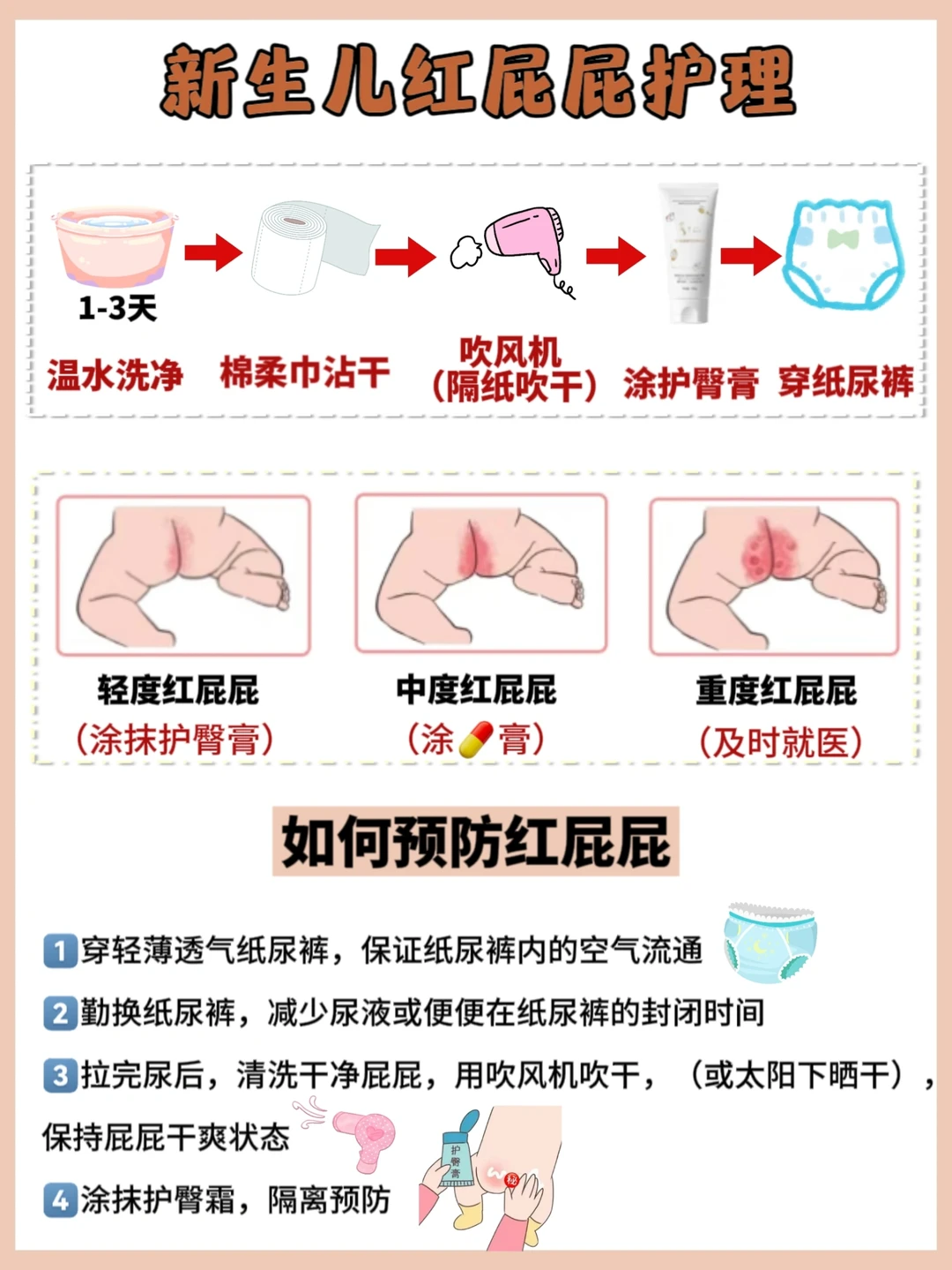 🌙13、纸尿裤2-3小时更换一次,洗屁屁尽量不要用湿纸巾擦,用流动的水冲洗。
