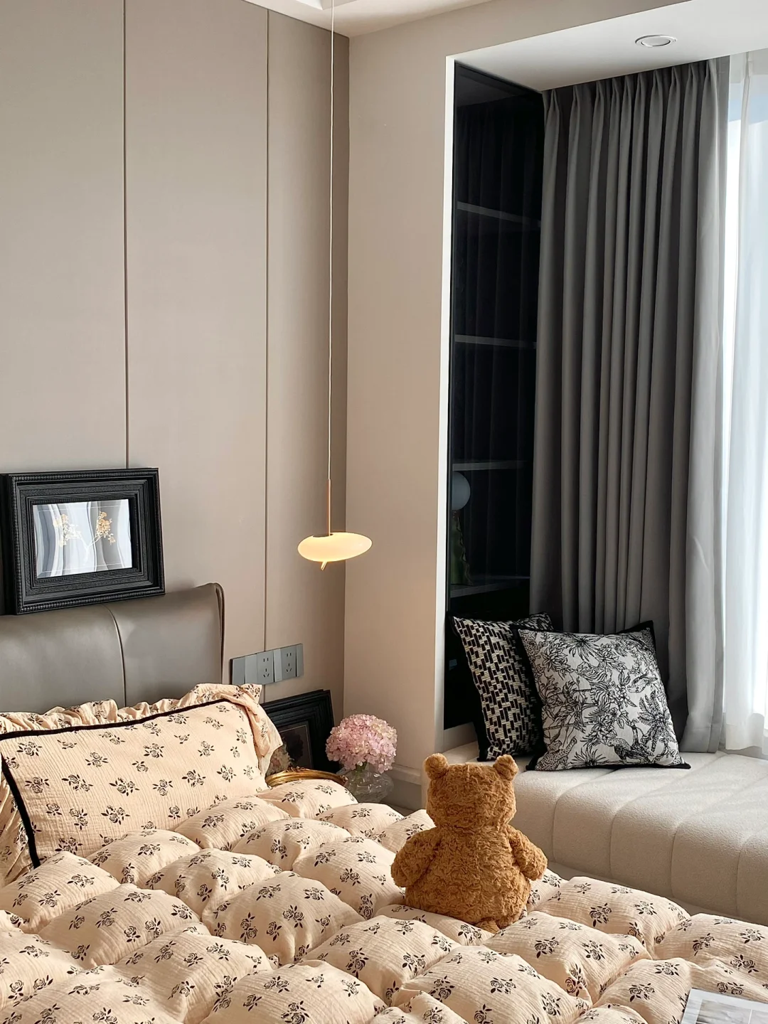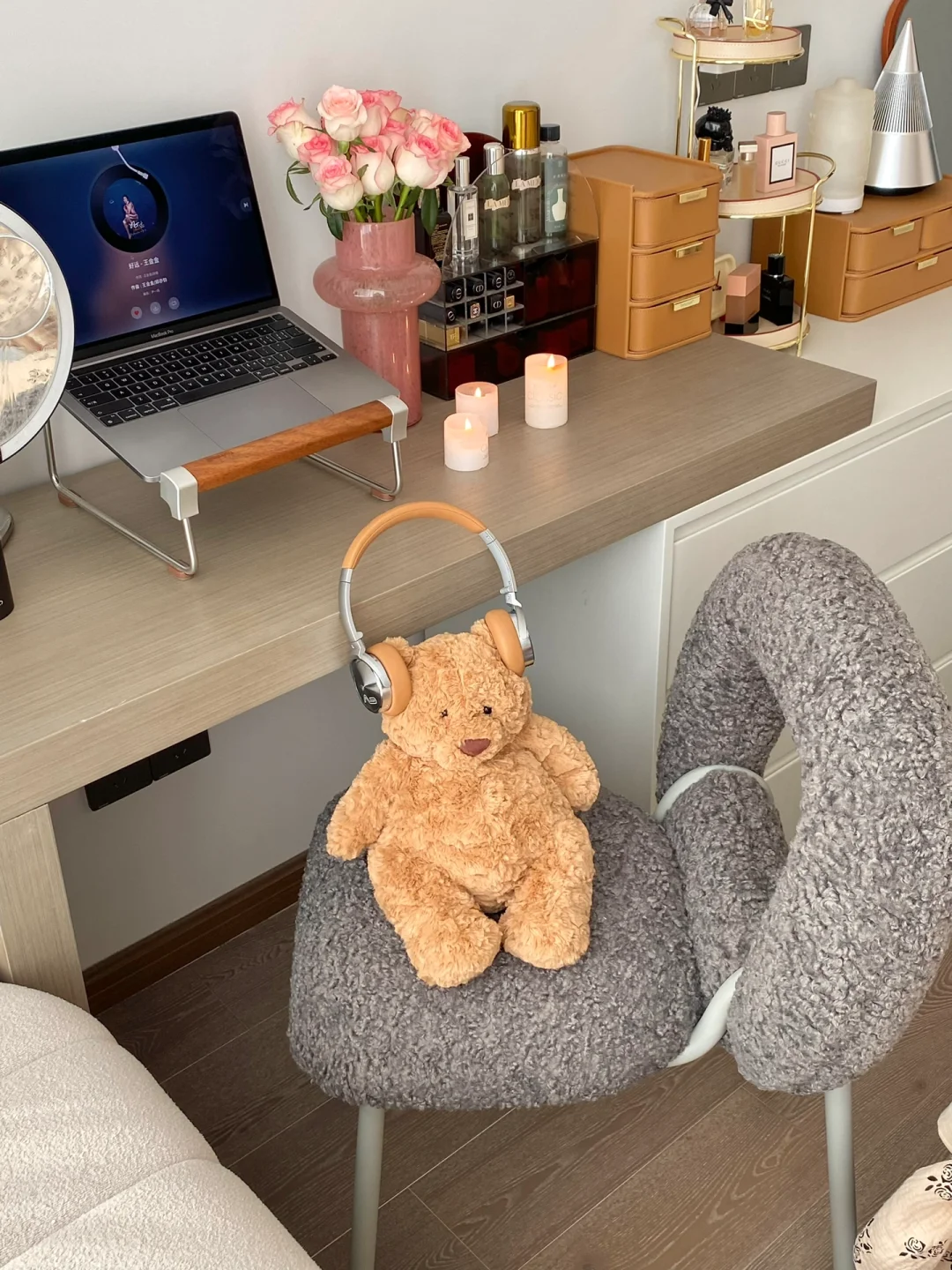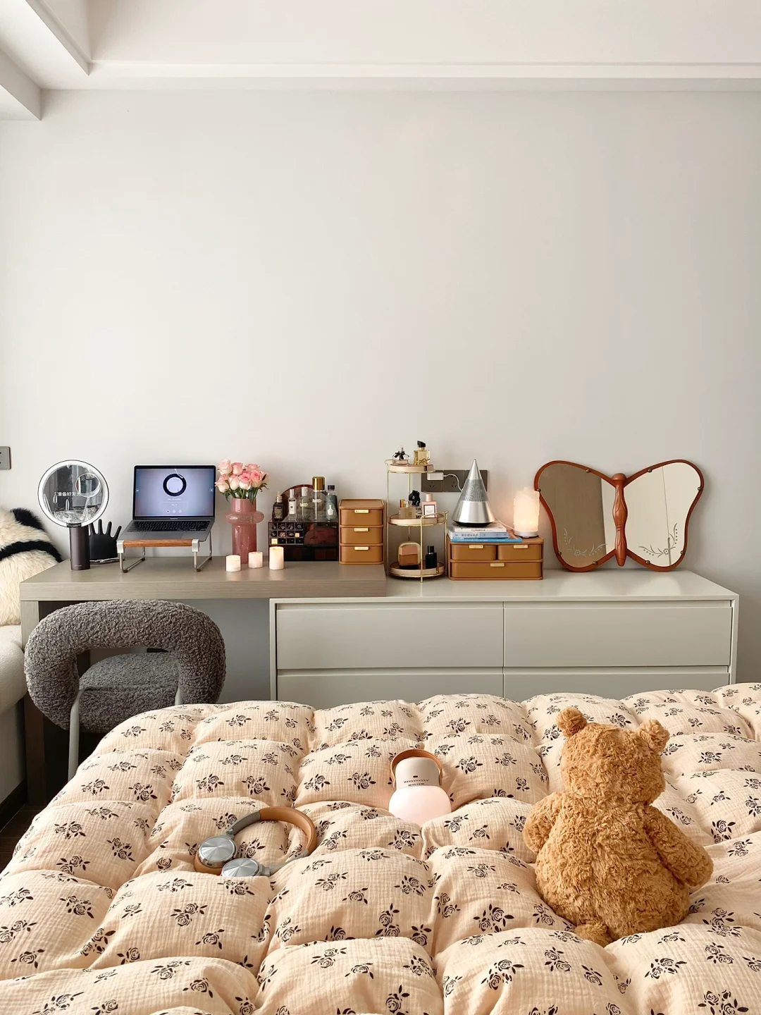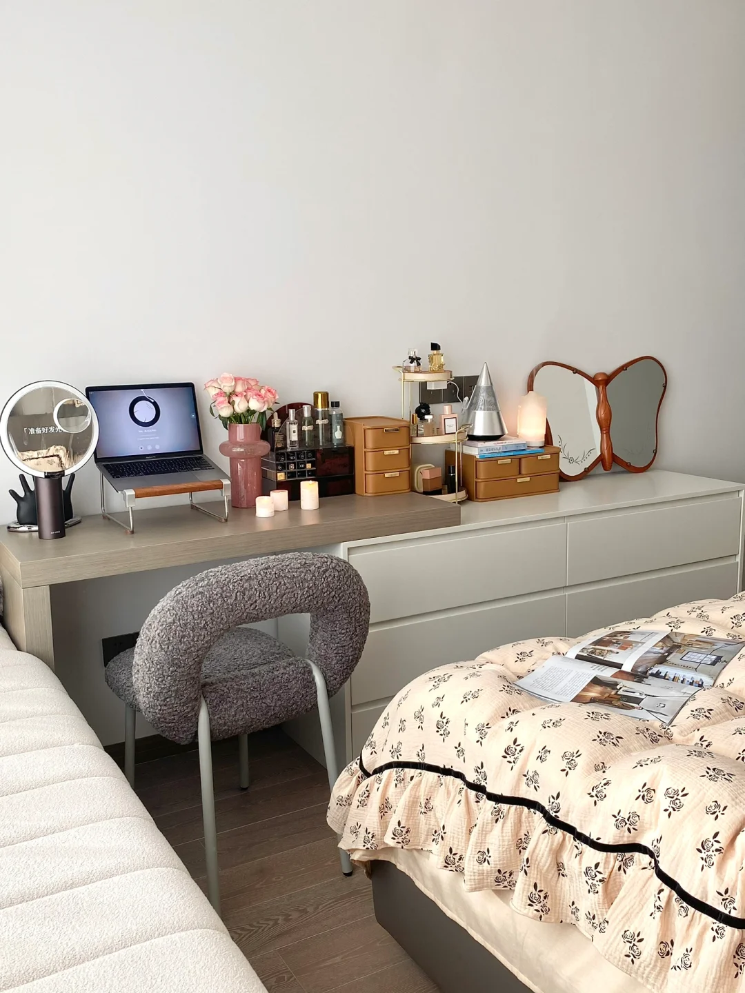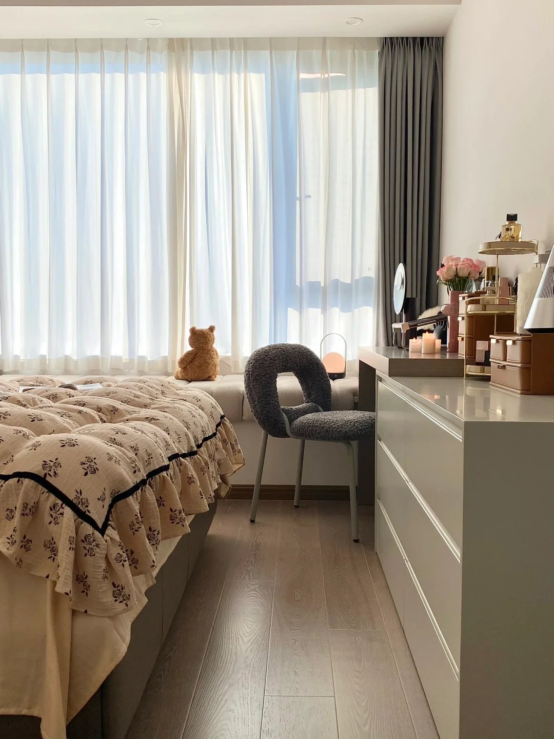 🏷️床尾距离1.2米,放下斗柜不影响使用,搭配灰色的化妆椅简单又耐看