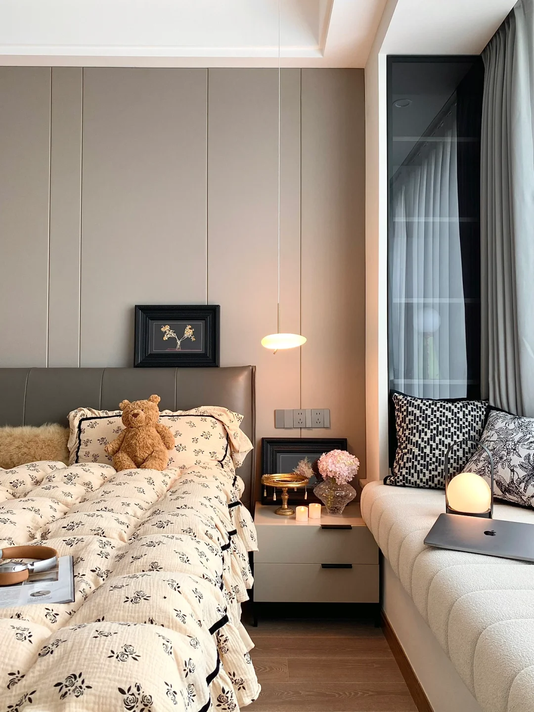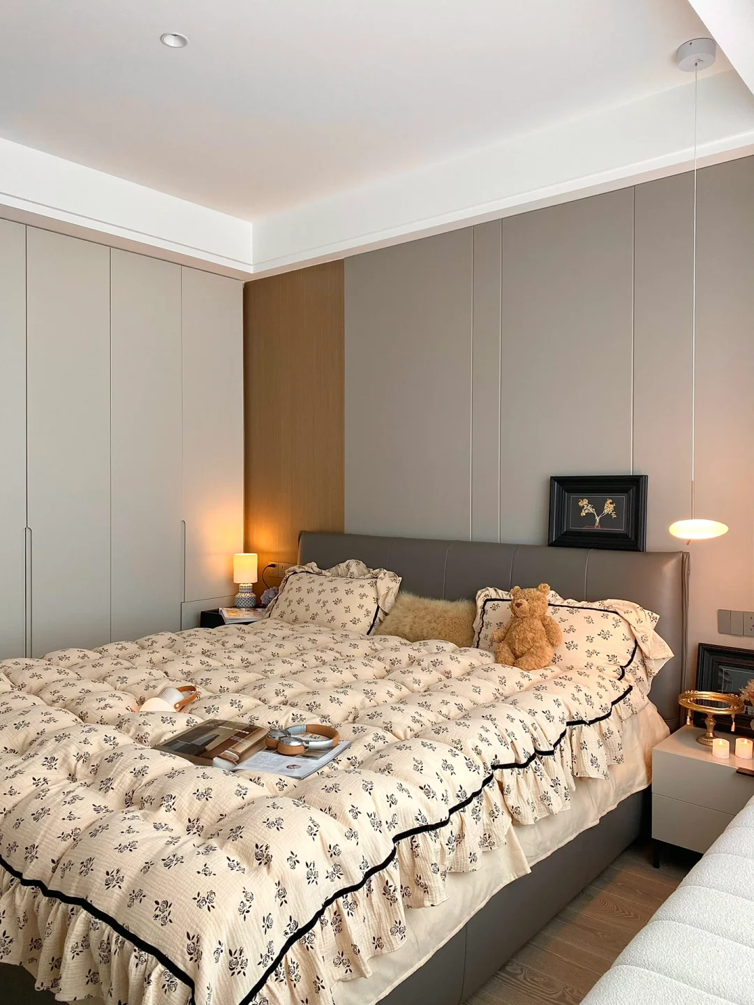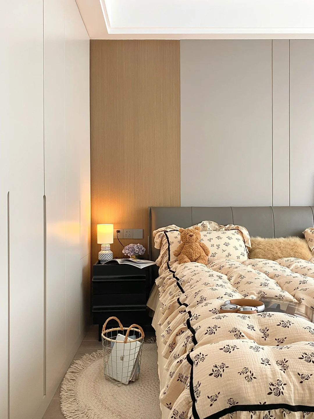 🏷️床头背景墙是皮质硬包搭配木饰面,好打理不怕刮花。
