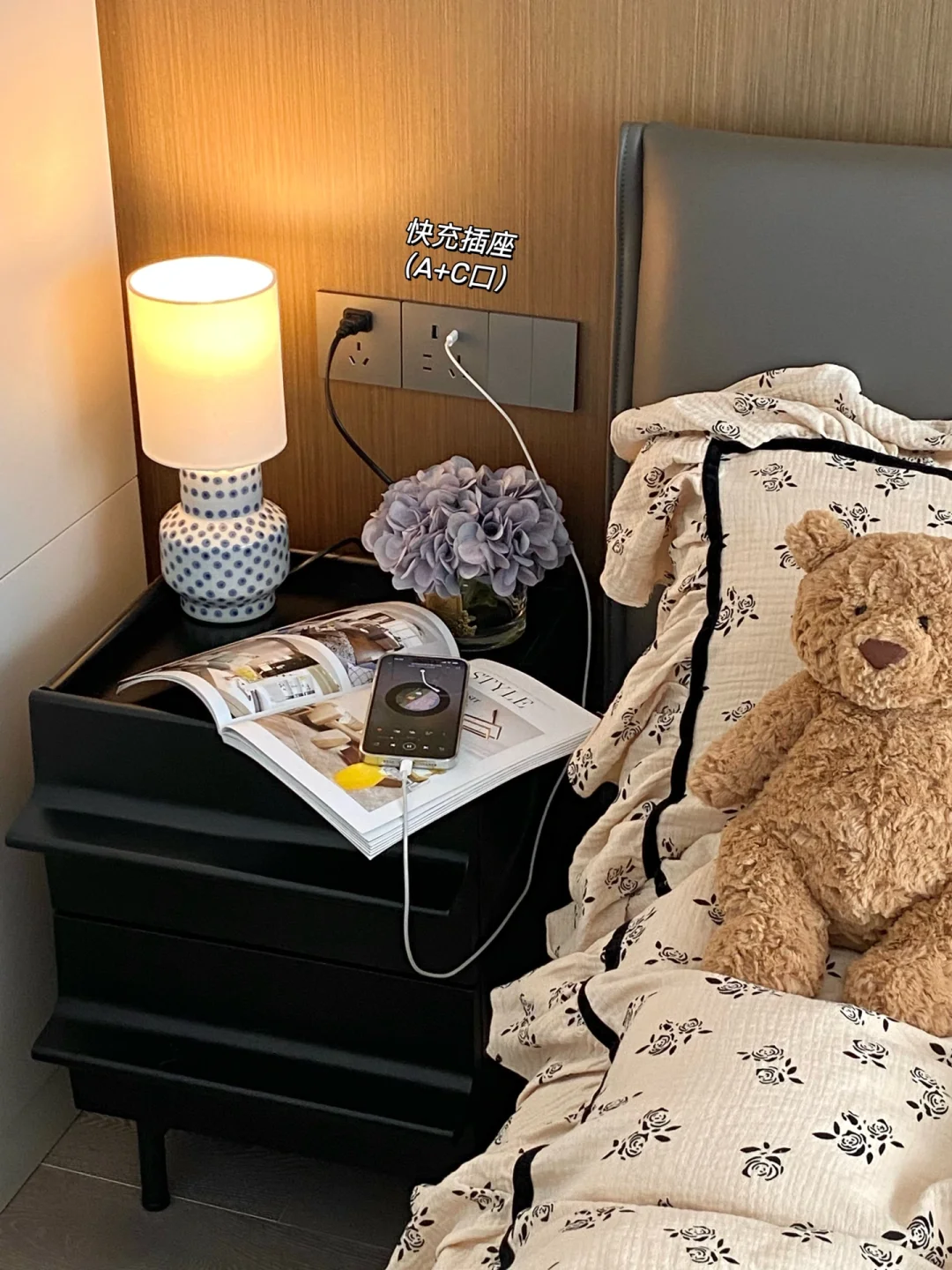 卧室为了方便自己使用,左侧这边装了带USB和快充接口的,手机充电超方便。