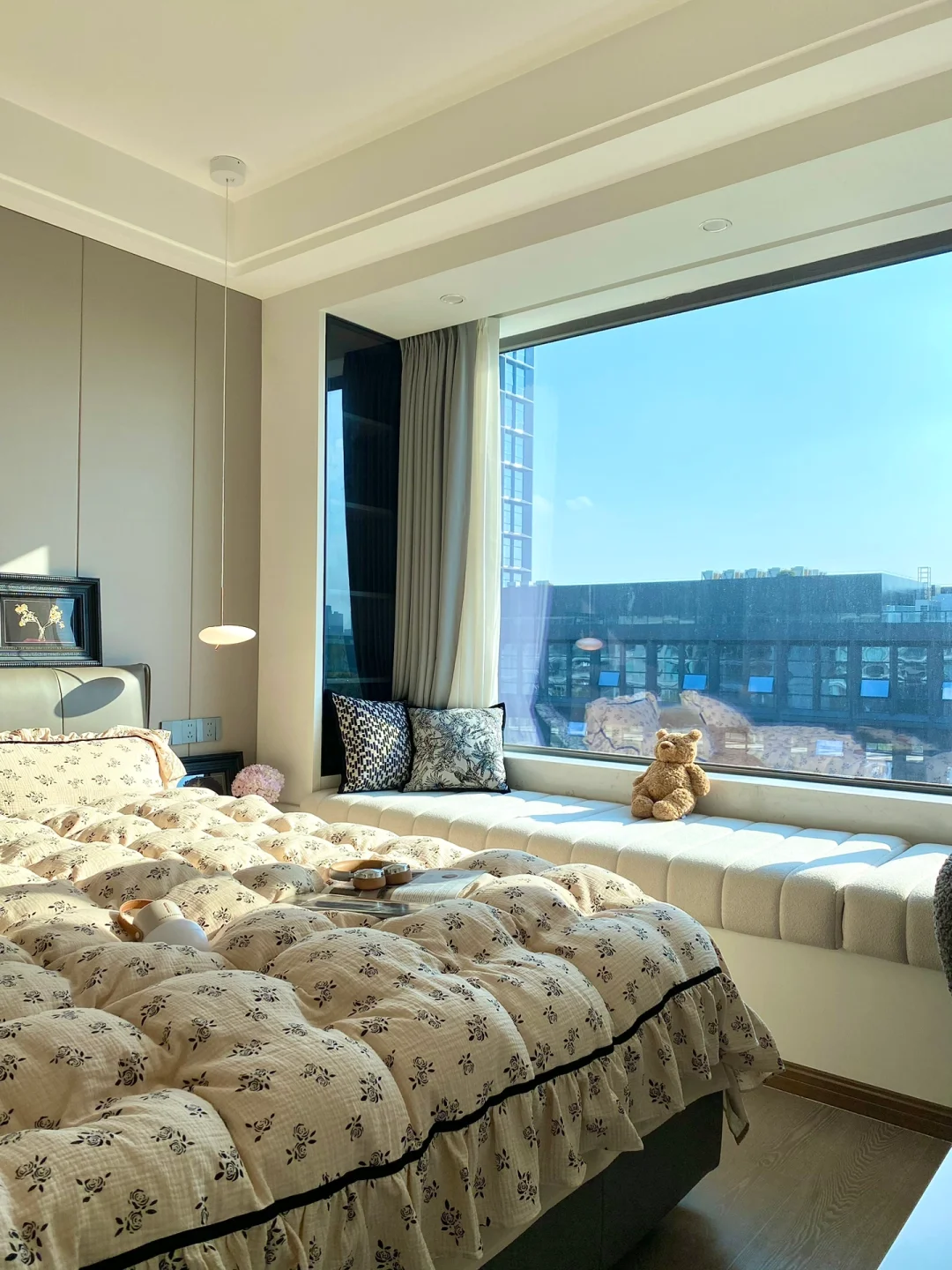 床尾斗柜化妆桌一体、一门到顶衣柜、60厘米宽大飘窗铺上飘窗垫又是一个放松休闲的好地方