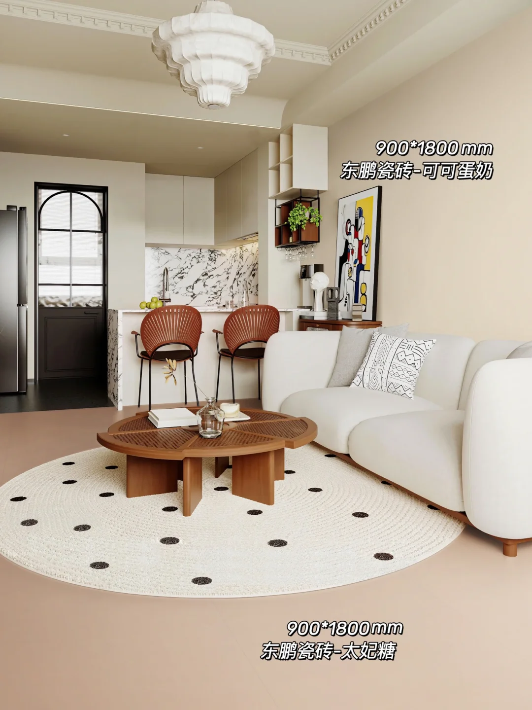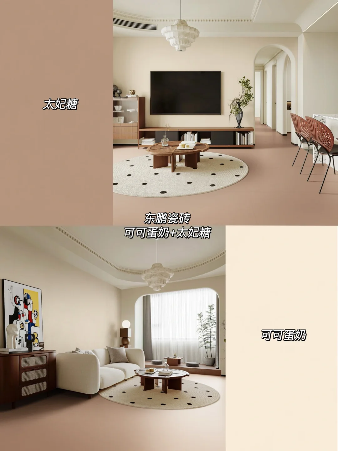 像我家这种现代简约风格就挺适合灰色的瓷砖。像我闺蜜家是轻法式奶油风格,挑了很久选择了东鹏瓷砖的太妃糖和可可蛋奶。像这两款柔光转简直太温柔了,手感摸上去也很柔和,效果图出来之后也太好看啦,还可以密缝铺贴,整个空间浑然一体而且特别显大显温柔,太喜欢了,期待铺贴好的整体效果~大家喜欢的话可以多看看东鹏家素色系列,每款都好看,挑花眼的程度哈哈~