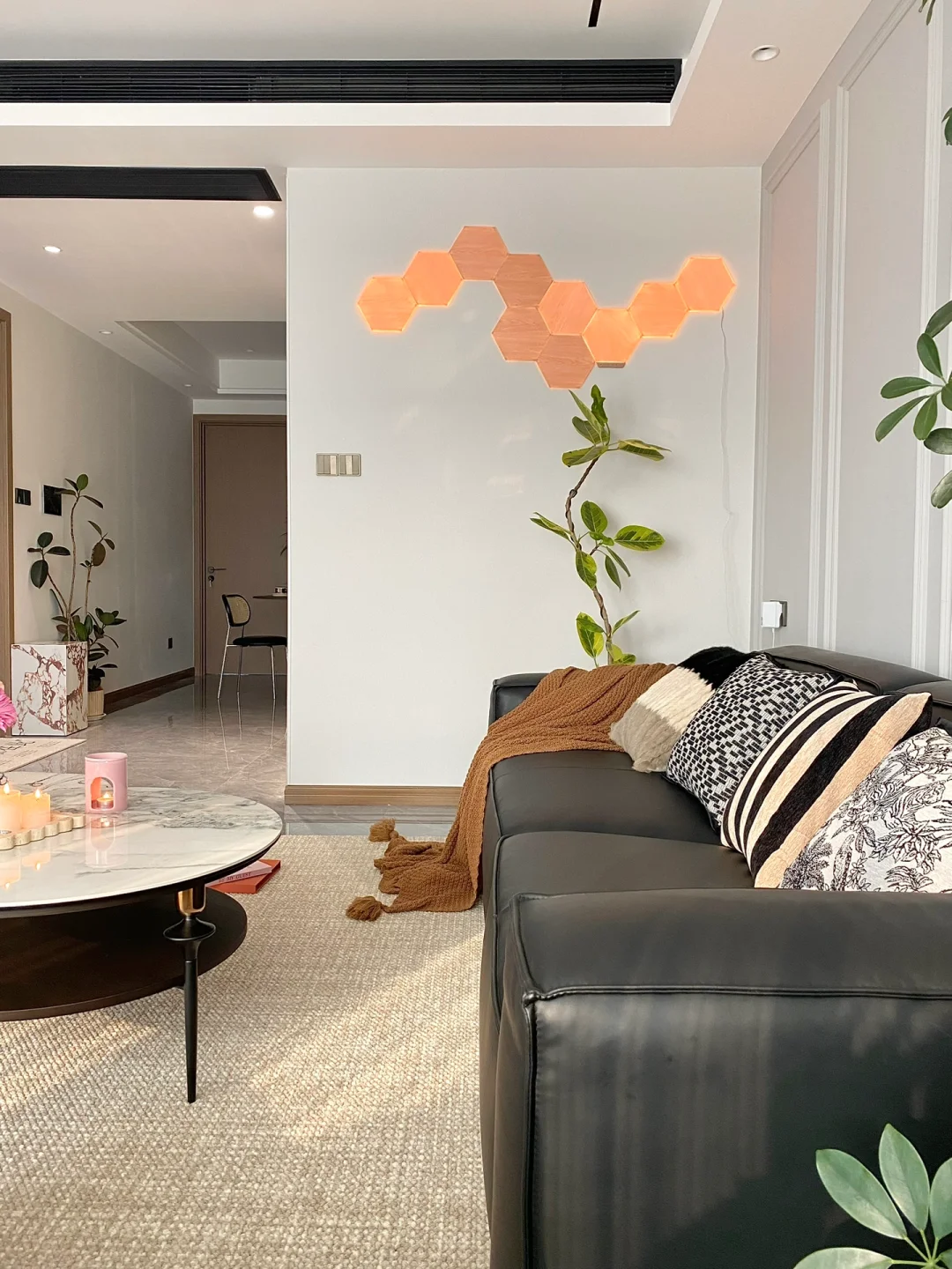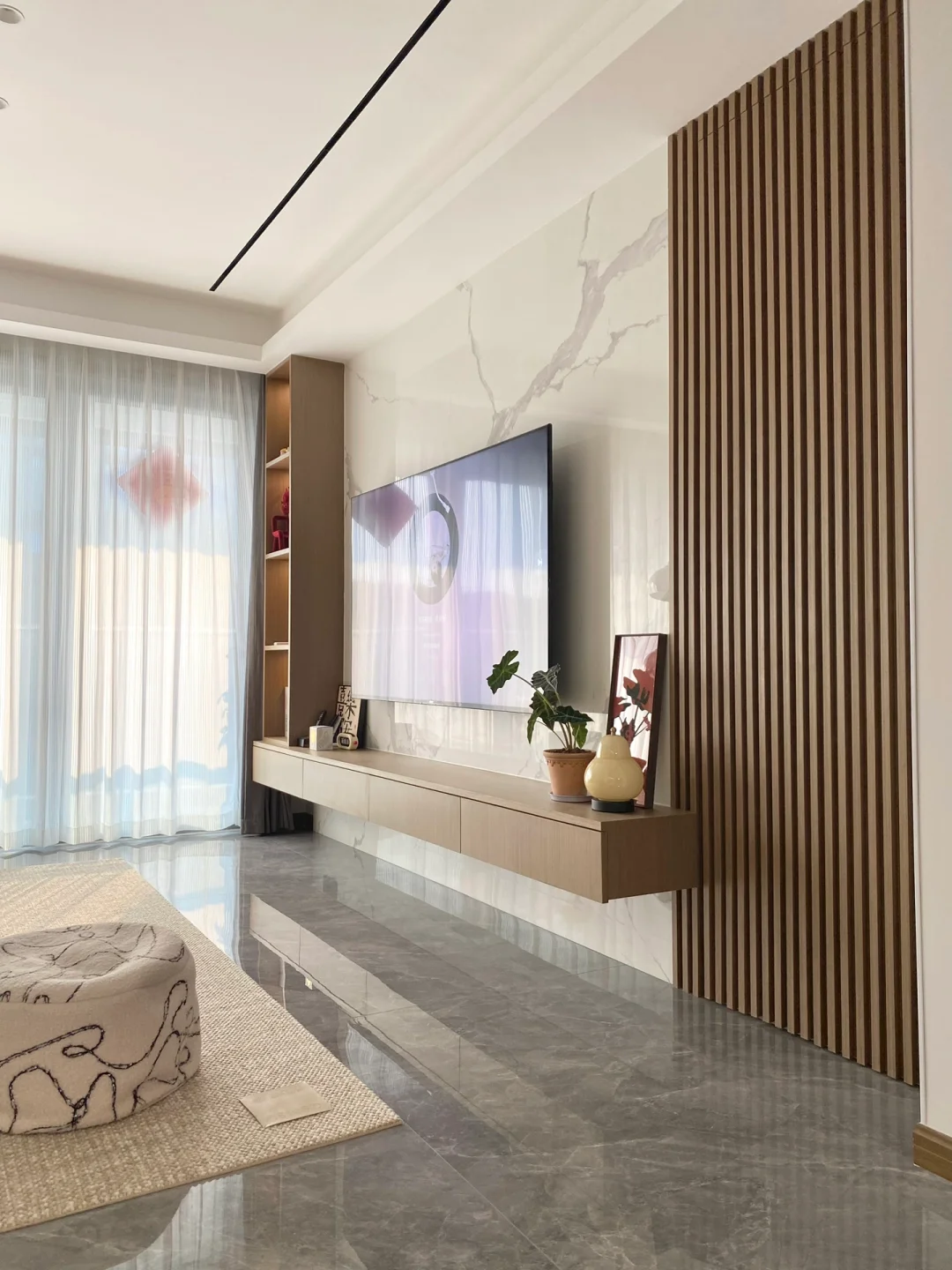 🏷客厅开间4米,沙发背景墙用了省钱又好看的石膏线,拼接木饰面点缀;电视机背景墙做了悬空柜