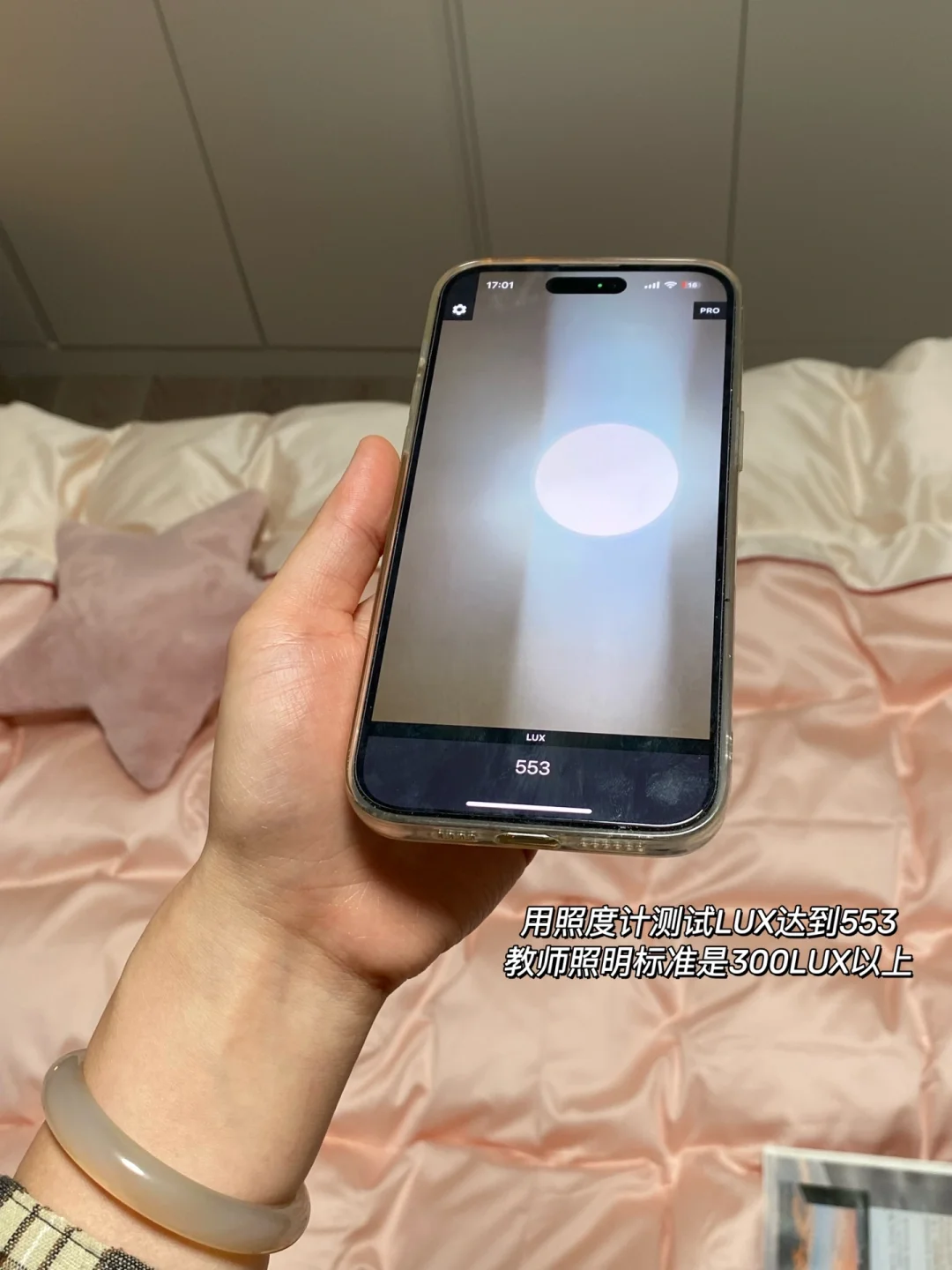 光照覆盖区域大,测试几个常用点位照度高达500LUX,符合教室照明高标准,基本上打开灯卧室的各个角落都有均匀的光照,使用起来更安心。