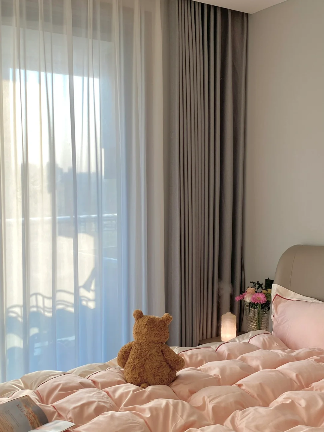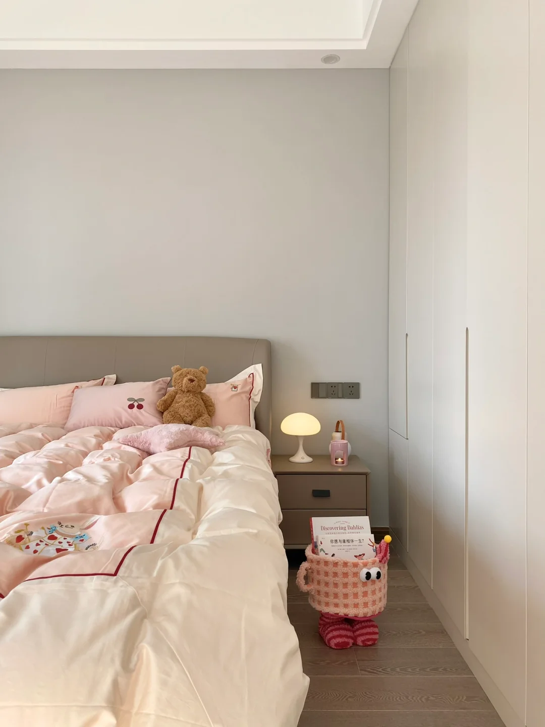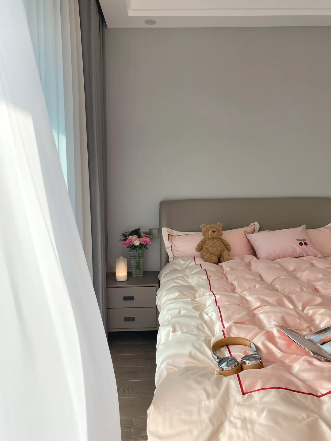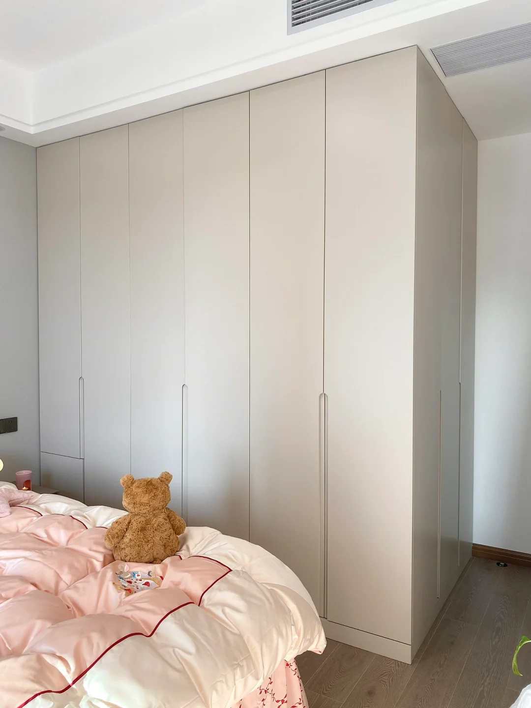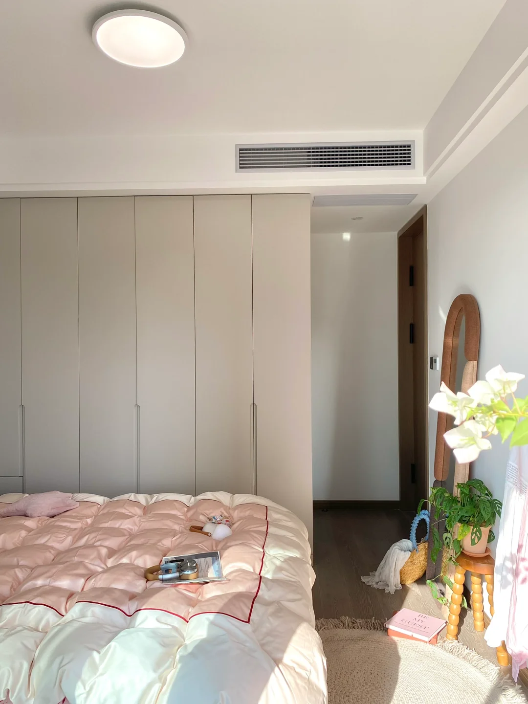 L型衣柜大大提升了收纳空间,床头背景墙简单刷了浅灰色乳胶漆,耐看又省钱,窗帘也是灰色搭配金刚纱,遮光度很不错~