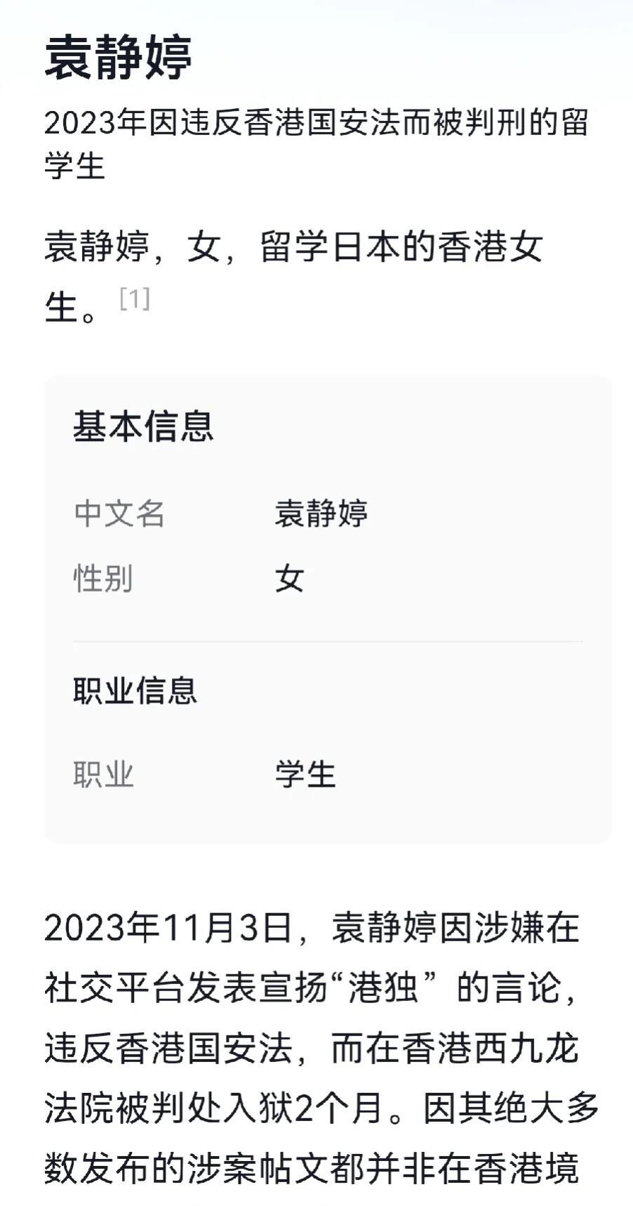 香港一女生在日本留学期间因为发表港独言论,回香港后于11月3日被九龙区法院判处2