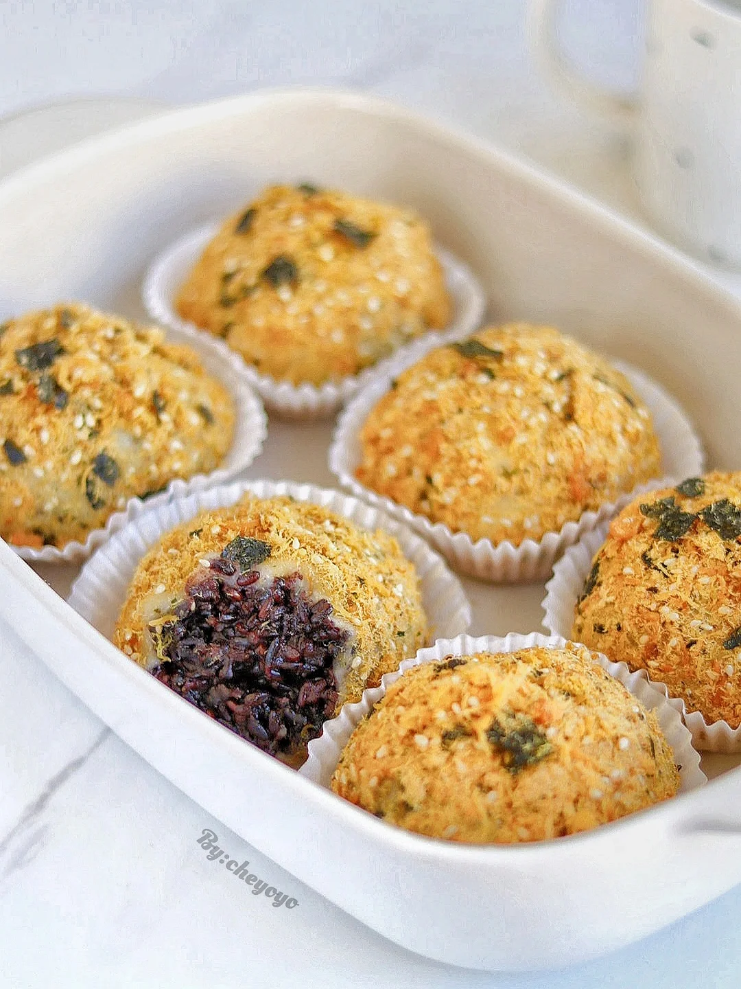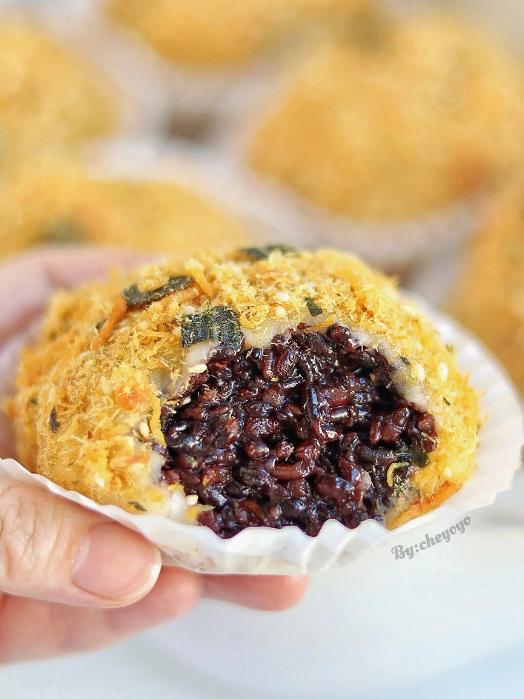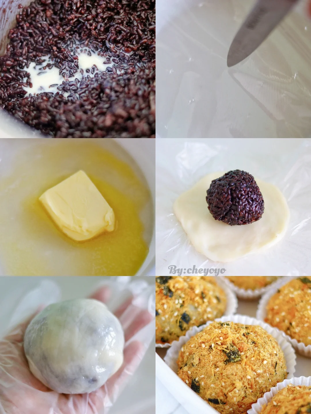 3⃣️ 麻薯压扁包入紫米馅,表面刷沙拉酱后裹上海苔肉松就ok了🤗