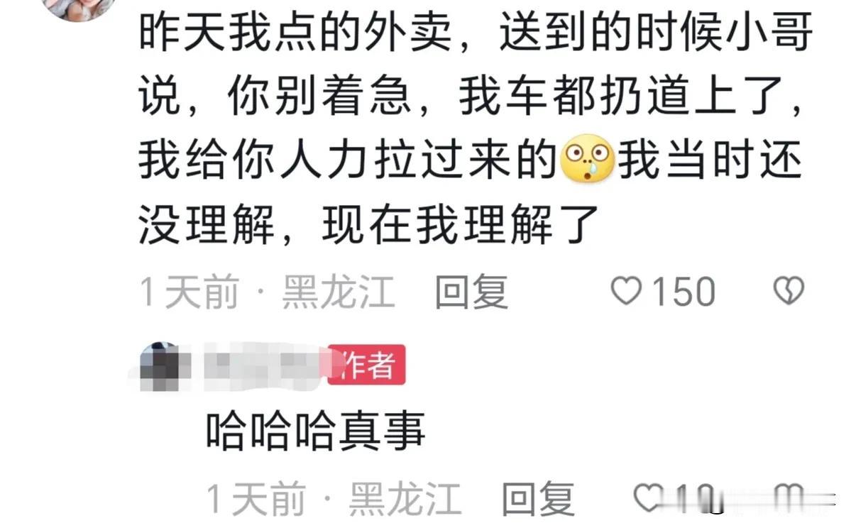如果你在黑龙江下大雪的城市,叫了外卖请不要催促外卖员,因为雪真的很大,很多道路电瓶车都开不了,他们可能送餐是用走的,想想你自己都走不出去,外卖员也是人大雪天电瓶车也很难上路,多一些理解,千万不要投诉。 网友:昨天我点的外卖,送到的时候小哥说,你别着急,我车都扔道上了,我给你人力拉过来的我当时还没理解,现在我理解了。