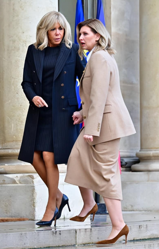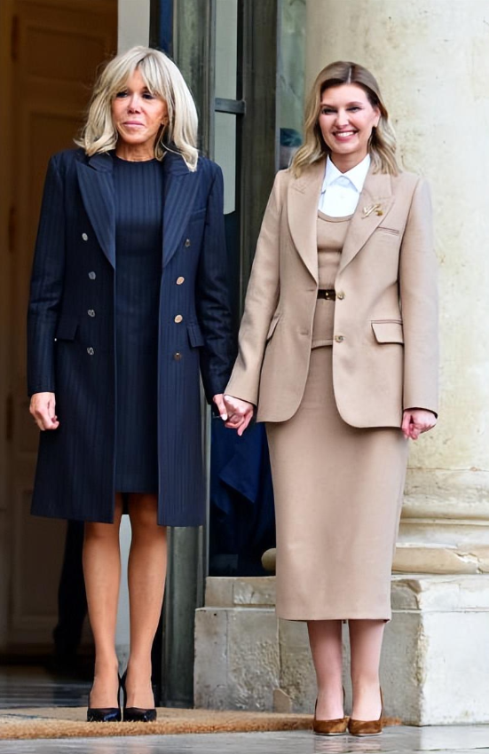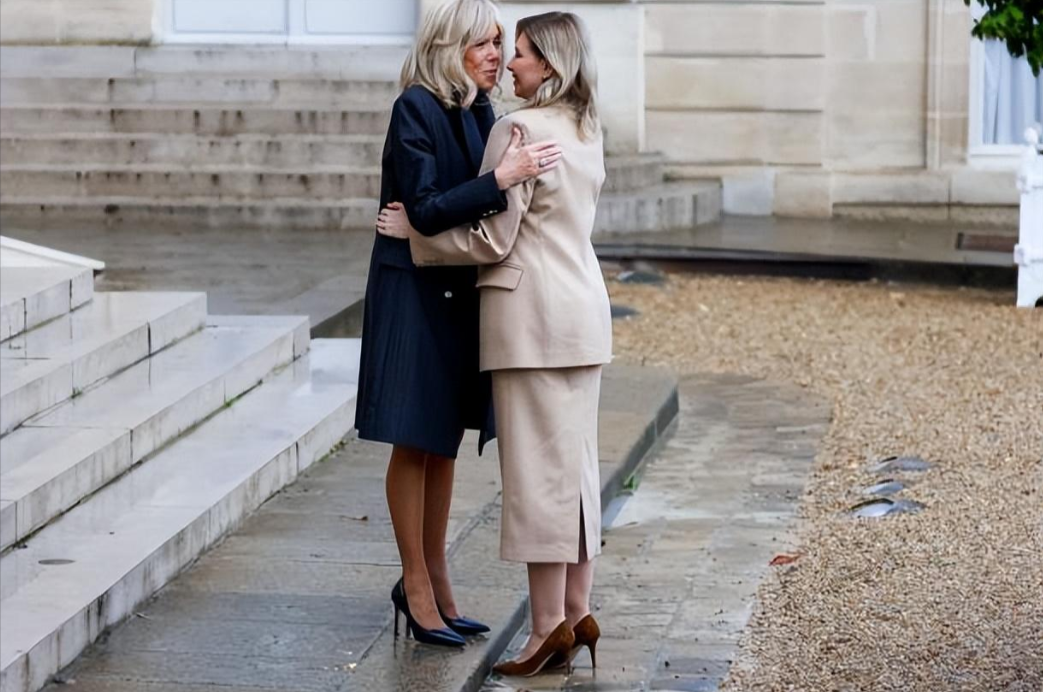 乌克兰第一夫人访问法国并到达爱丽舍宫与法国夫人见面,但她的地位似乎不高,被拍下来站在台阶下拥抱法国夫人,拍照时也始终处于下风。然而,她的穿着还是很时尚的,咖色套裙知性高级大气,只是不穿打底袜有些失策。
