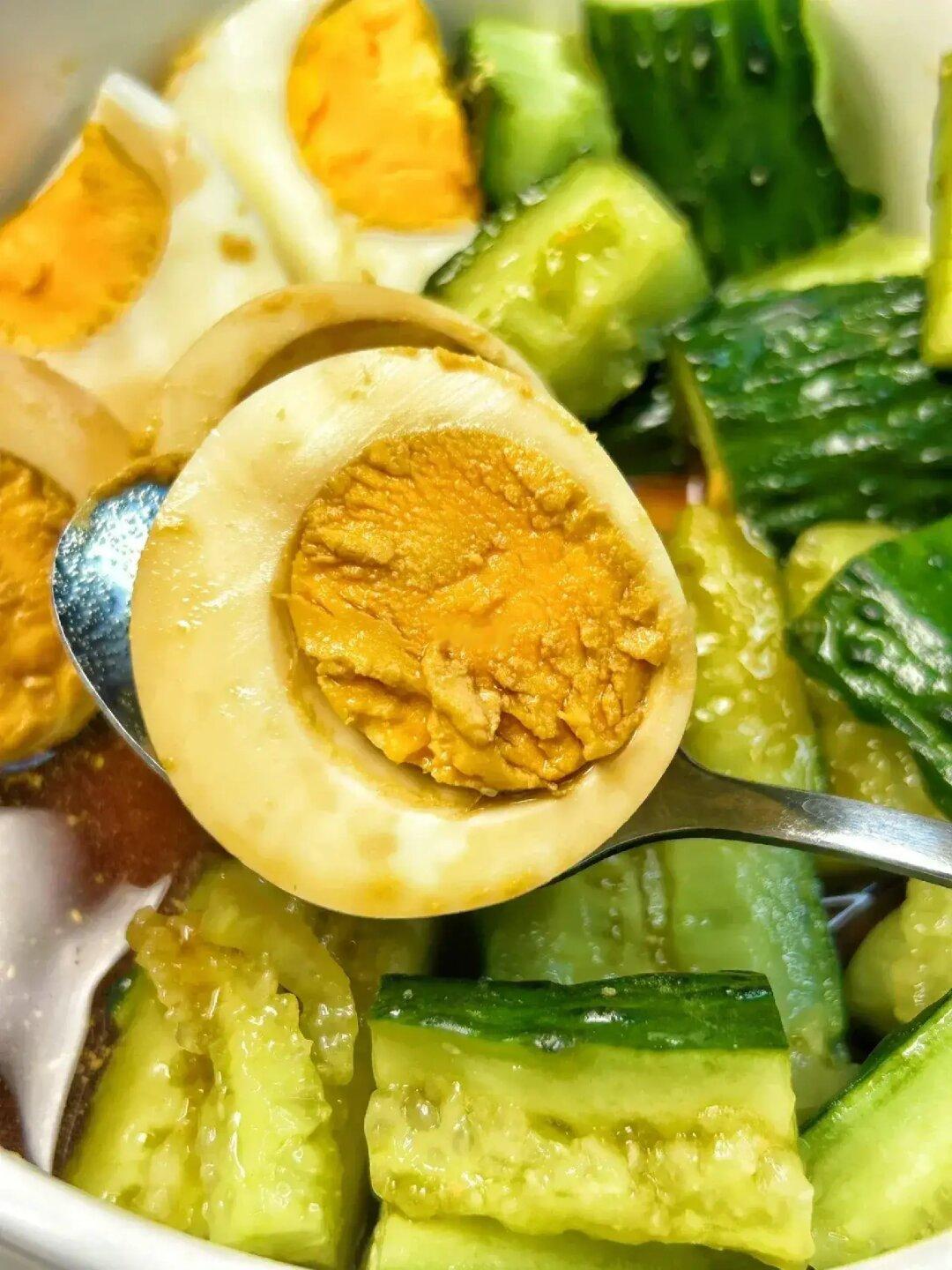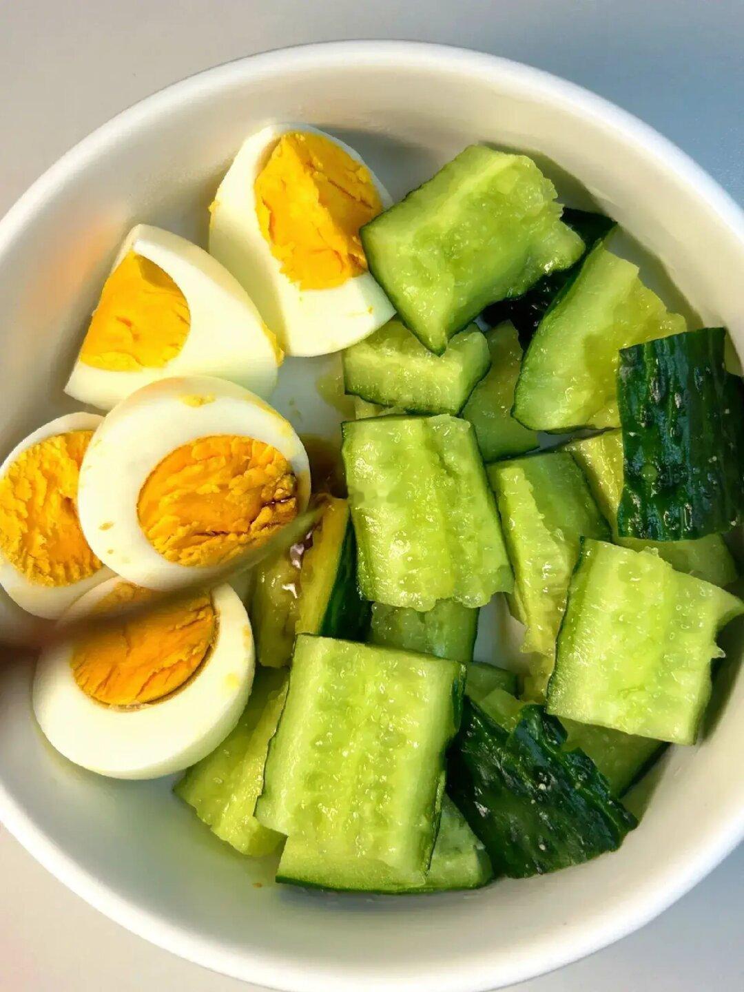 黄瓜和鸡蛋,这是什么原理?只要晚上吃一碗,第二天早上就掉2斤 本来以为是网上的噱头,没想到真的掉了,简直是爱了,我要每天吃! 🙌做法 [一R]黄瓜用刀拍碎,然后切块状,鸡蛋煮8分钟左右,剥壳切开 [二R]加一勺生抽、一勺陈醋、少许香油,搅拌均匀即可!