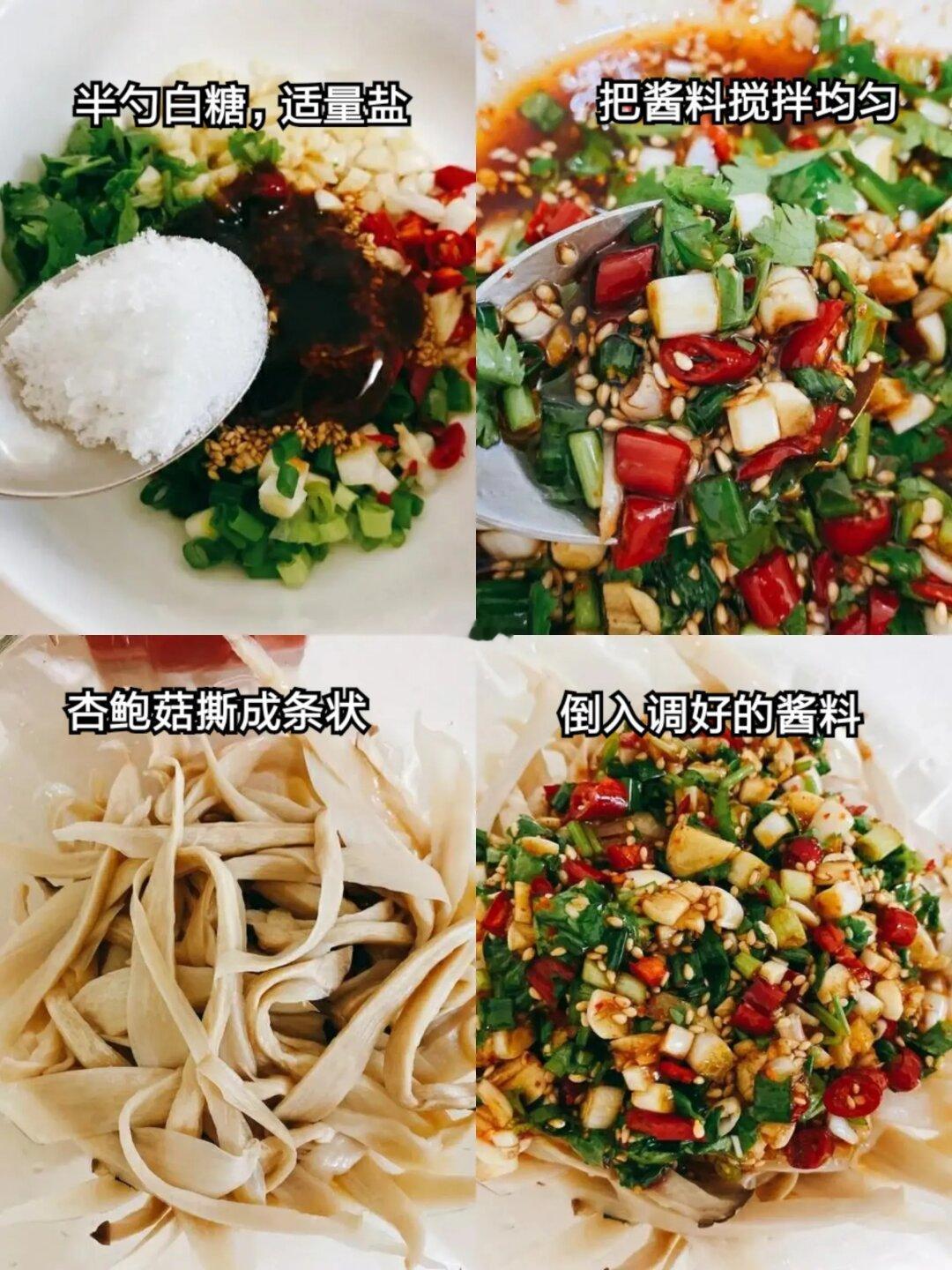 [四R]再加入半勺白糖和适量盐,用勺子把酱料混合均匀蒸熟的杏鲍菇撕成条状