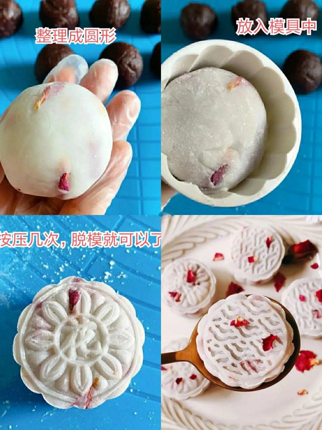 [六R]像包包子一样包好,整理成圆形,月饼模具内滚一圈熟糯米粉,把包好的月饼放入模具内
