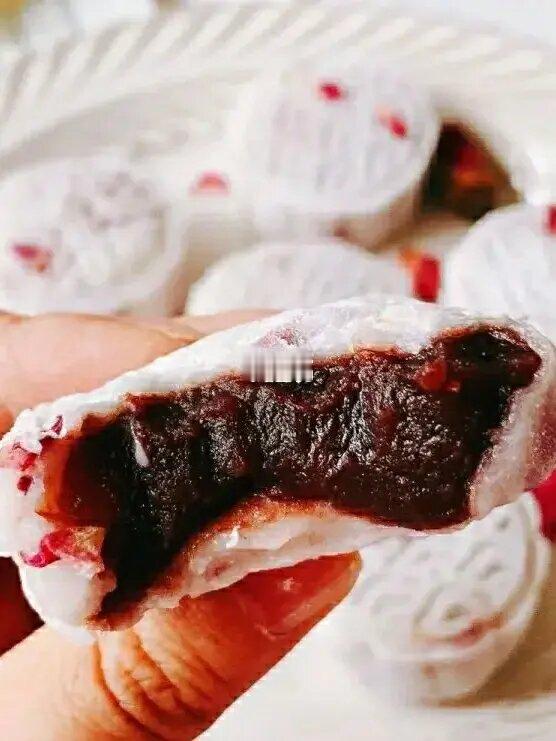 [五R]豆沙馅也是分20克一个,面团粘点熟糯米粉,用擀面杖擀开,放上豆沙