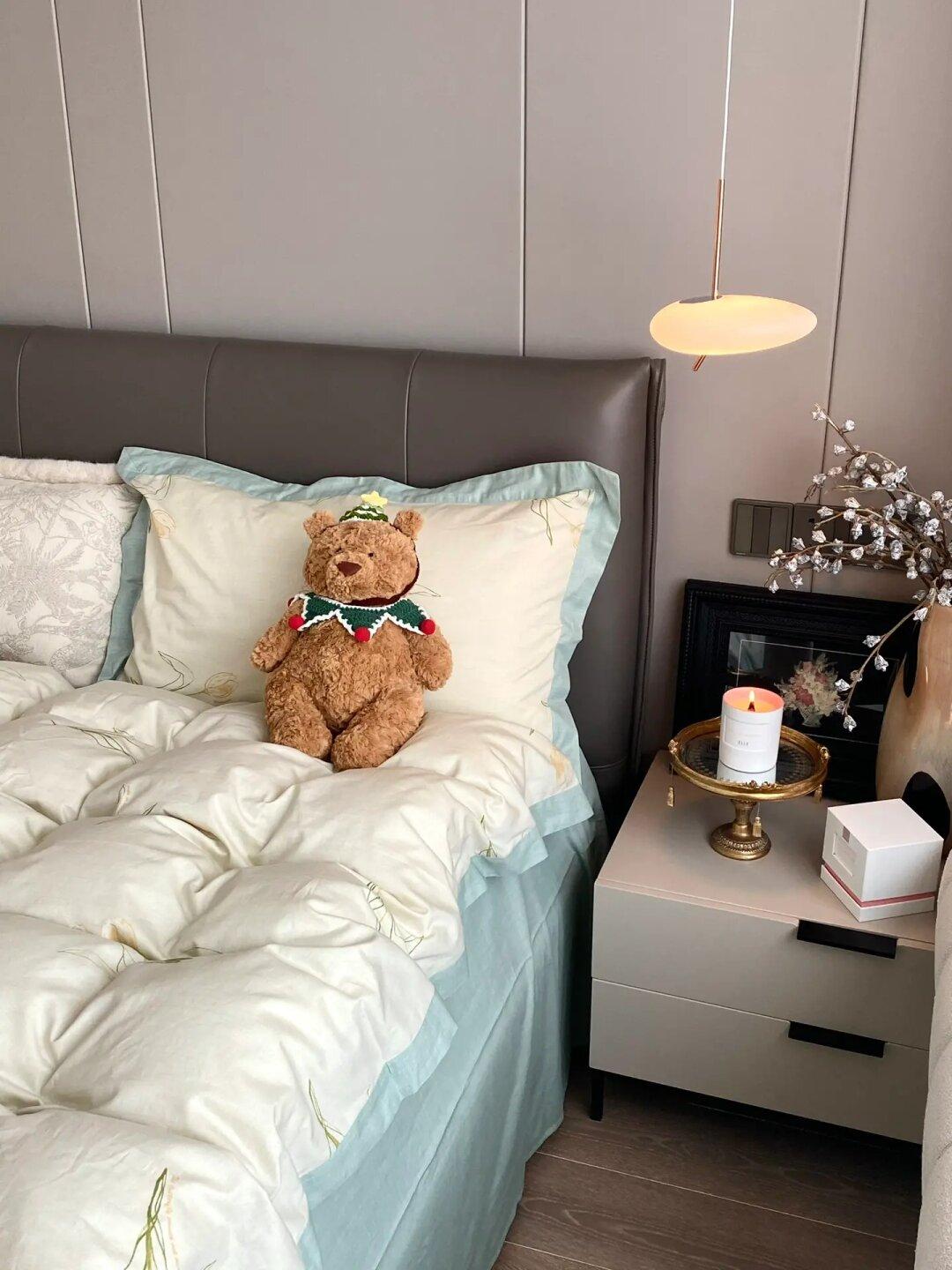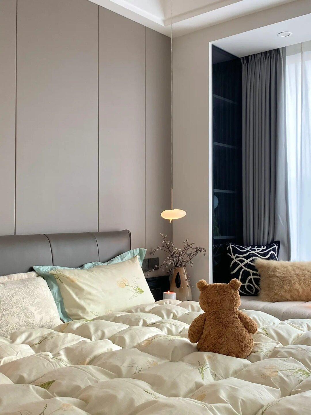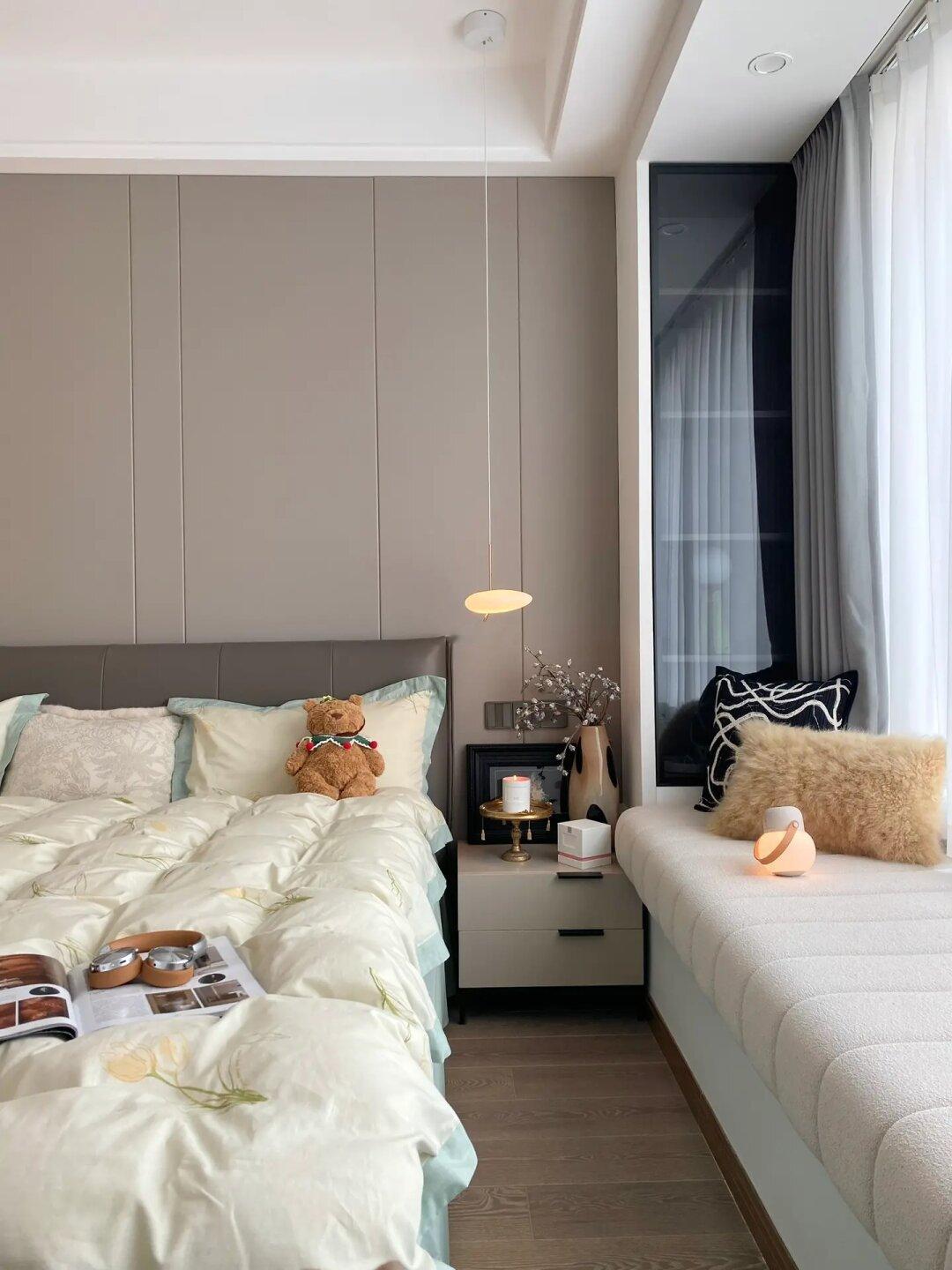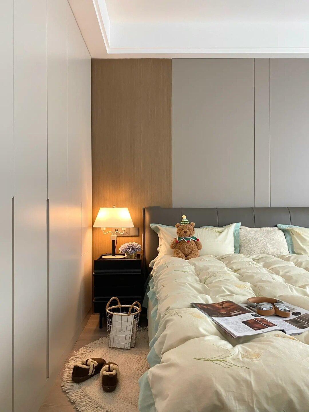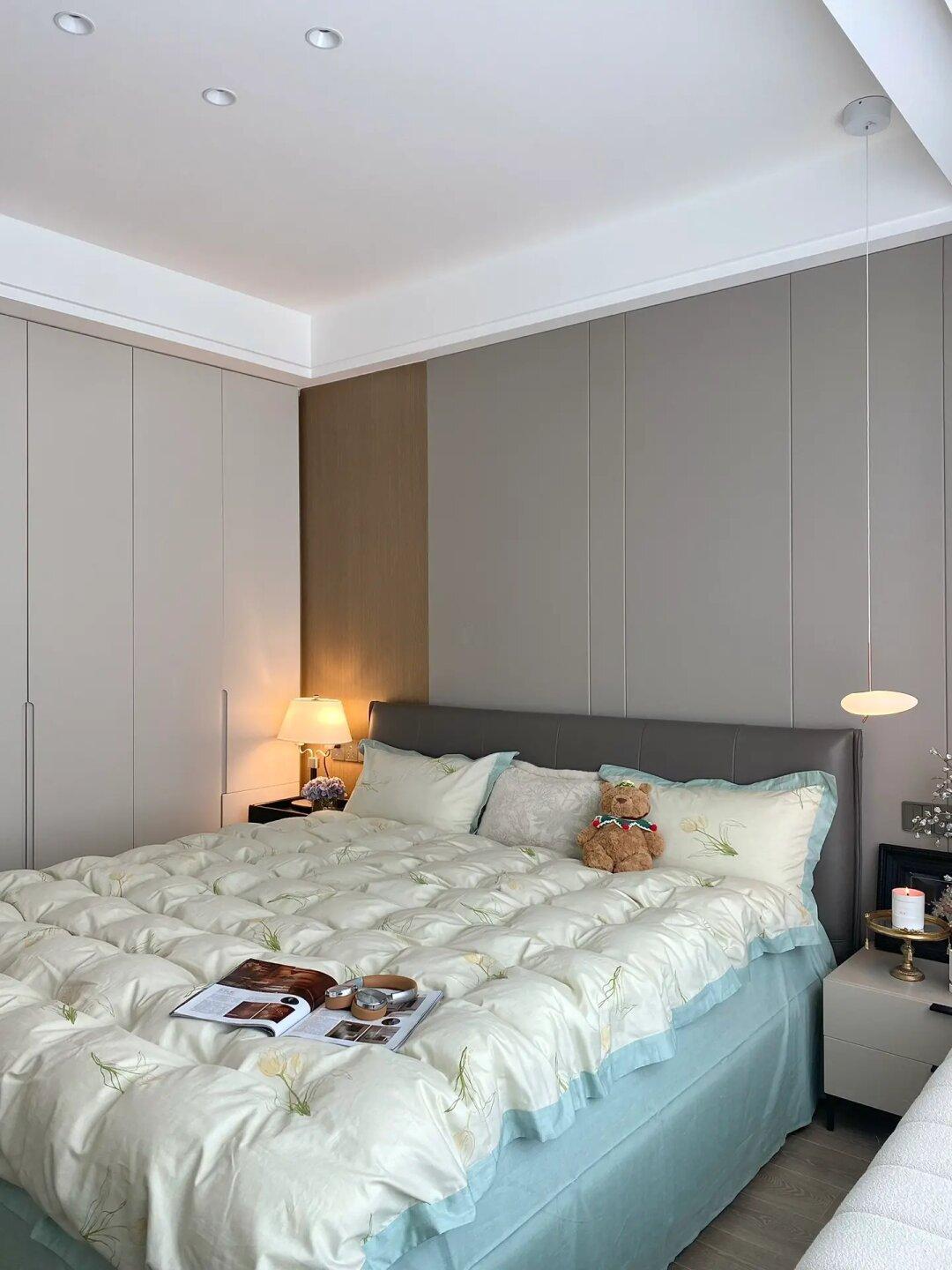🍂床头背景墙是皮质硬包搭配木饰面,好打理不怕刮花。