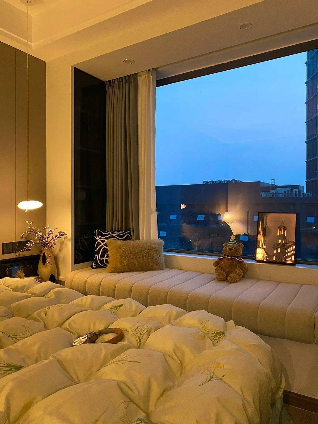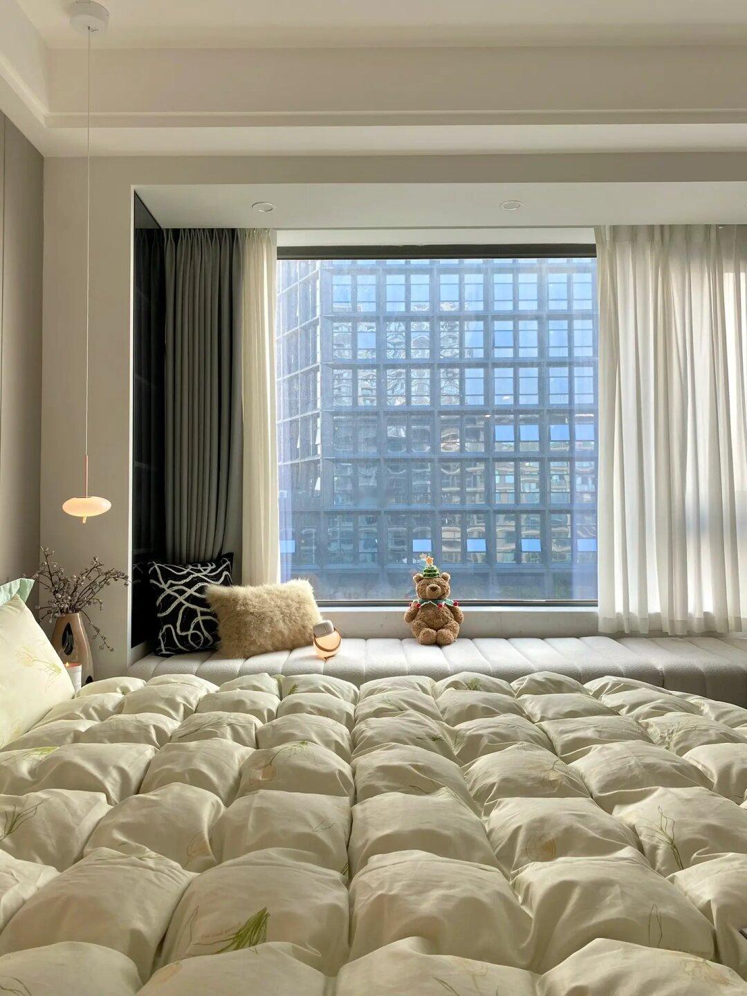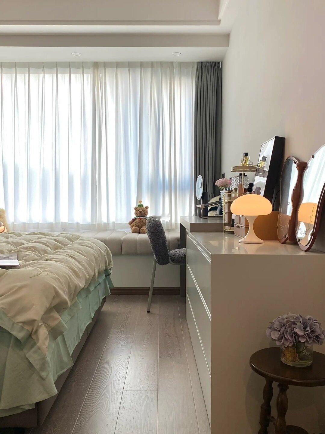 我的主卧一共13平米,自带卫生间和储藏室。装修都是按照自己的喜好来的,想要的一切都能安排上!床尾斗柜化妆桌一体、一门到顶衣柜、60厘米宽大飘窗不能砸,铺上飘窗垫又是一个放松休闲的好地方.