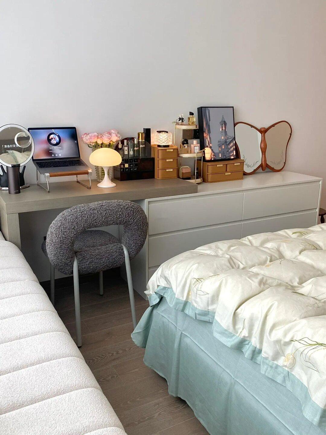 🍂床尾距离1.2米,放下斗柜完全不影响使用,搭配灰色的化妆椅简单又耐看