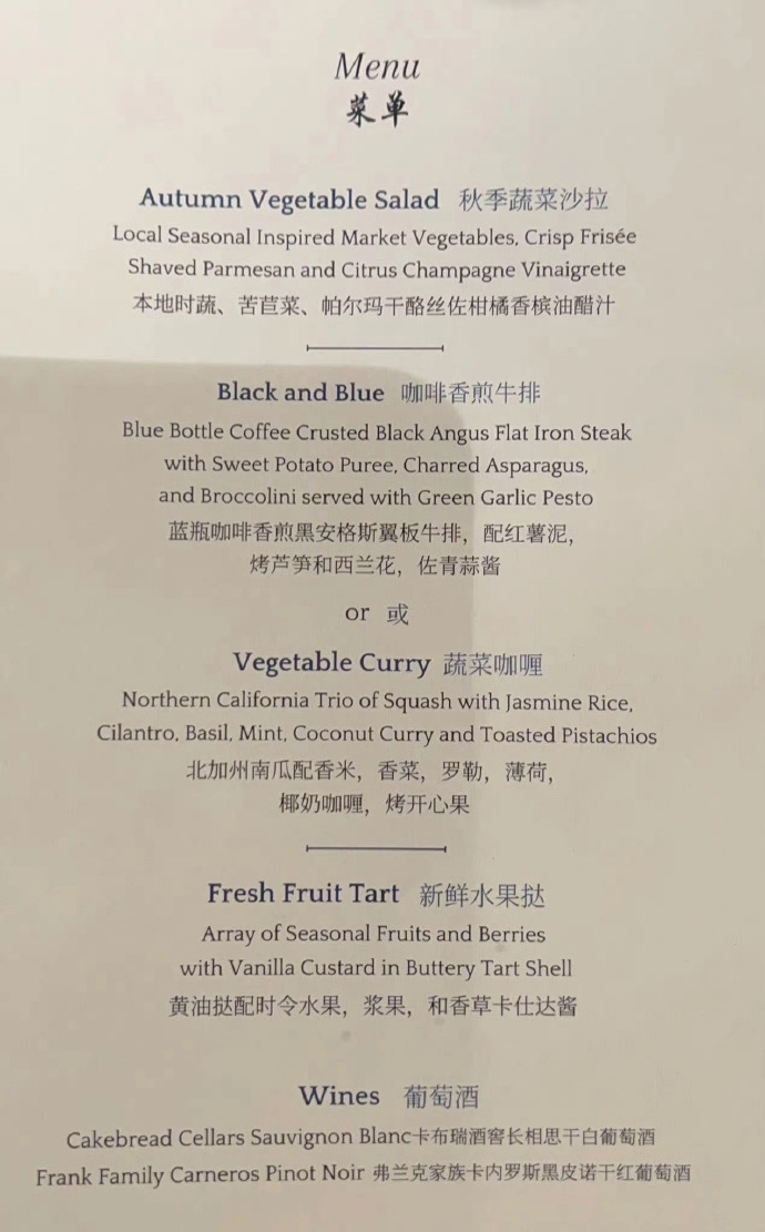 11月15日APEC峰会晚宴现场曝光,其中这些贵宾吃的菜单也被曝光,有秋季蔬菜沙拉、本地时蔬、苦营菜,咖啡香煎牛排,蓝瓶咖啡香煎黑安格斯翼板牛排,配红薯泥,烤芦笋和西兰花,佐青蒜酱或蔬菜咖哩,北加州南瓜配香米,香菜,罗勒,薄荷,椰奶咖喱等等。餐厅的环境也是超级干净豪华。