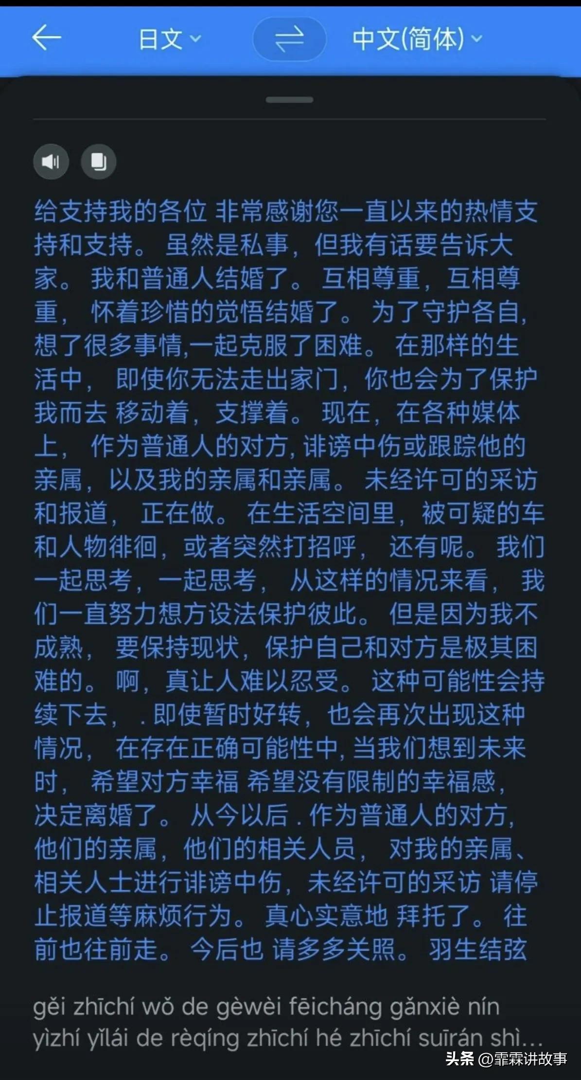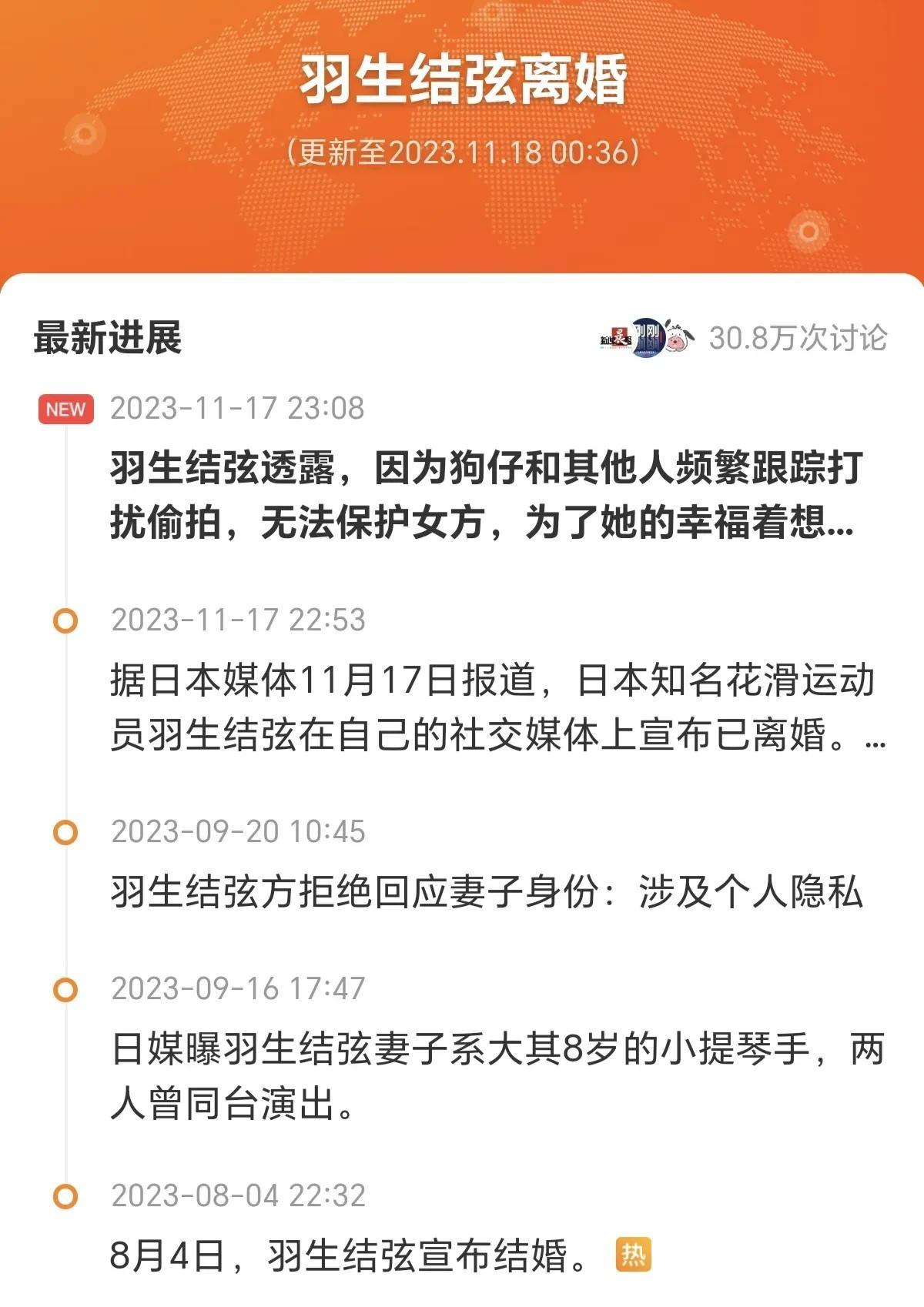 近日,日本花滑运动员羽生结弦官宣离婚。今年8月4日晚,羽生结弦才宣布结婚,短短3个月又宣布了离婚。 羽生结弦透露离婚原因:他的妻子是位普通人,婚后被各种诽谤中伤或跟踪她的亲属,以及我的亲属。未经许可的采访和报道,正在做。在生活空间里,被可疑的车和人物徘徊,或者突然打招呼,希望对方能够拥有没有限制感的幸福,因此决定离婚。 网友:羽生结弦好温柔啊!好男人,离婚是因为希望妻子过的更幸福,不被限制。 网友:狗仔偷拍打扰生活,这个离婚理由太牵强,结婚前女方也是素人,就没人偷拍限制生活么?