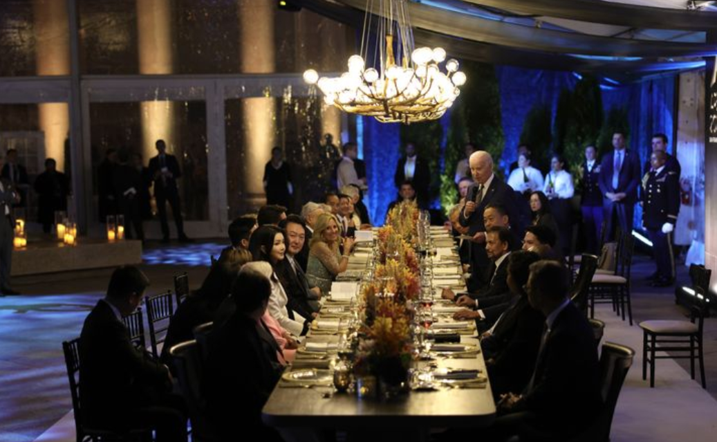 51岁金建希,皮肤也太白了,和欧美女性坐在一起,肤色居然白得发光;只能说她保养的太显嫩了,还有当天选择的衣服也是黑白配,衬托肤色显脸白,一张东方脸十分惊艳!