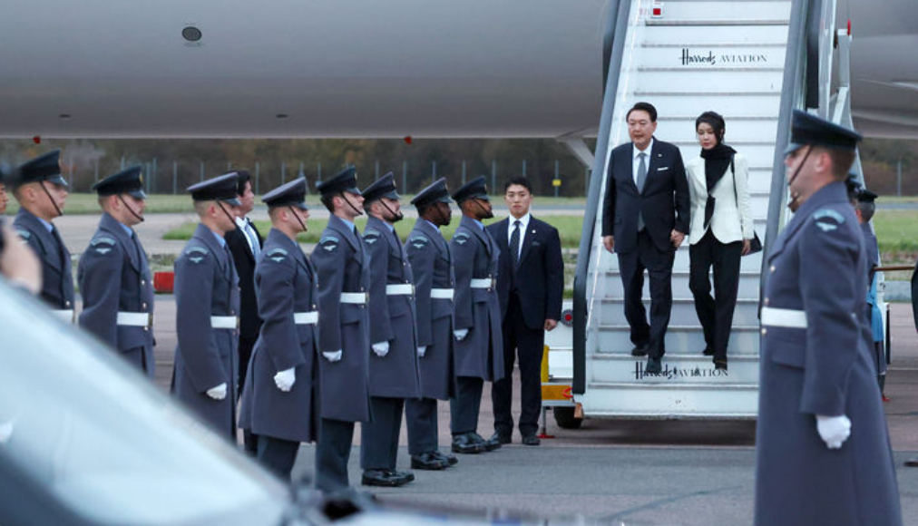 韩国夫人和老公抵达英国,还是出发时的服装,只是把黑色围巾塞进了白色西服里,一身黑