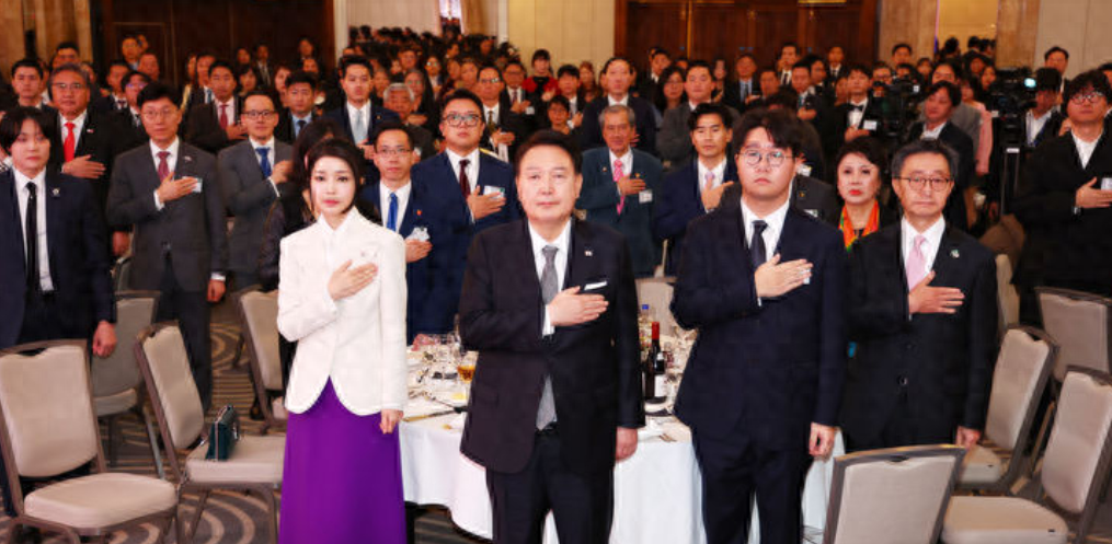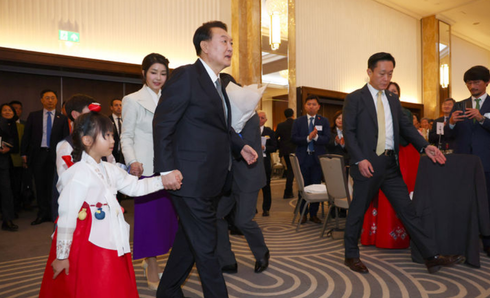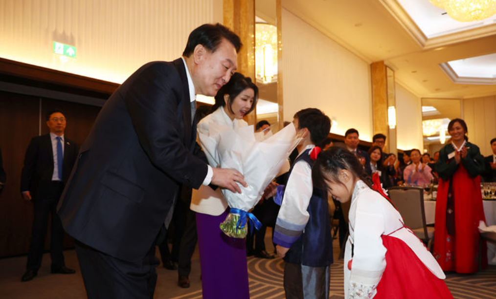 韩国夫人抵达英国第一个活动,出席韩国同胞会,穿白色西服配紫裙,一身撞色打扮牵着小