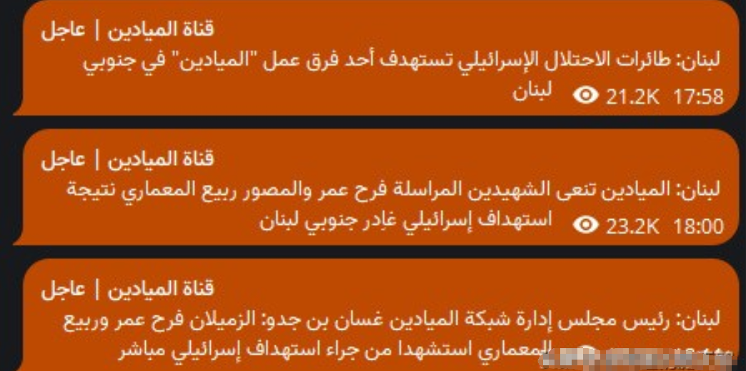 对报道真相的新闻记者下死手,太丧心病狂了!今天(11月21日),黎巴嫩媒体 Al-Mayadeen 的女记者法拉赫·奥马尔 (Farah Omar) 和摄影师拉比赫·马马里 (Rabih al-Maamari)在黎巴嫩南部采访时被以军无人机杀害。