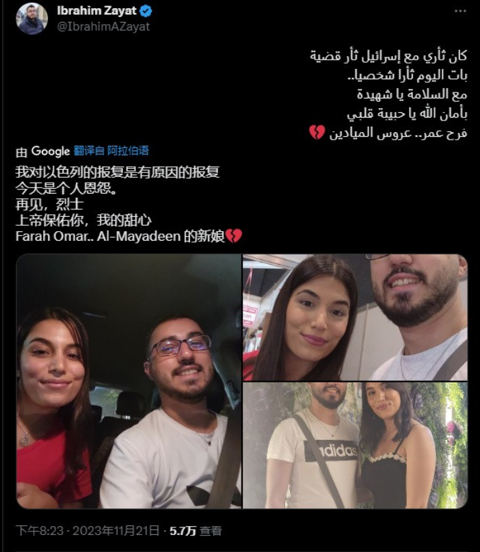 图7至图10是女记者法拉·奥马尔与她的恋人易卜拉欣·扎亚特幸福的照片。在听闻恋人遇害的噩耗后,易卜拉欣·扎亚特说他对以色列只有报复,而且是不死不休的那种。