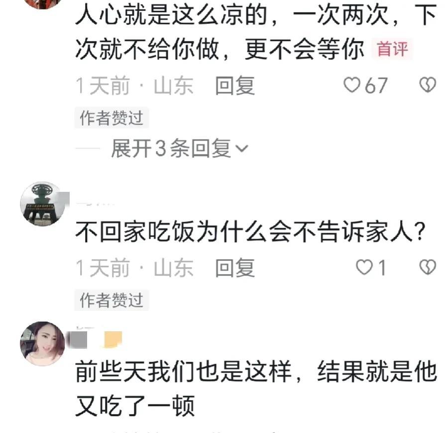 妻子等待丈夫回家吃饭,等到半夜,丈夫回到家里说自己在外面吃过了,妻子独自一人在厨房吃饭。 丈夫说:端出来吃吧! 妻子:你都不吃,算了吧!我以为你要回家吃饭,我一直在等你,如果……下次不回家吃饭,记得提前跟我说,我都等饿了。 网友:妻子情绪好稳定。 网友:人心就是这么凉的,一两次,下就不给你做了,更不会等你。