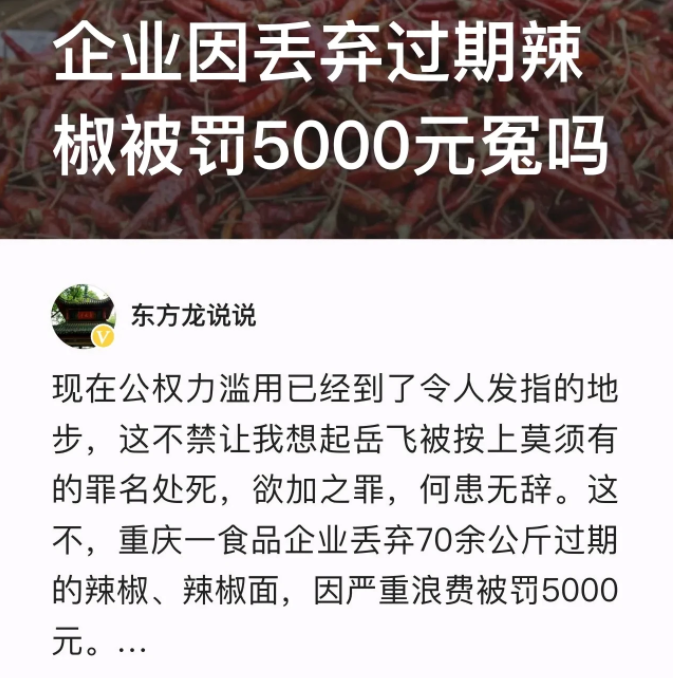 “企业扔掉过期辣椒被罚款,一点都不冤!”重庆,一食品公司,因为扔掉了70公斤的过