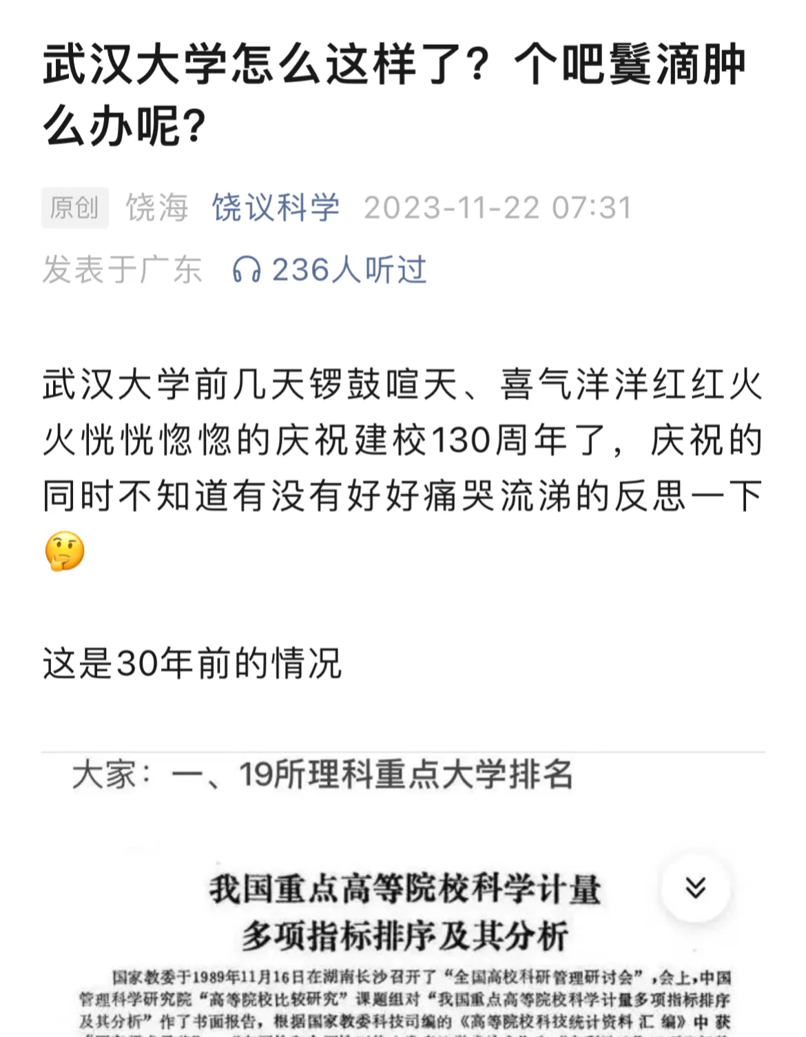 武大130周年校庆,两个杰出校友都掀起了波澜:一个杰出校友,雷军感恩学校培养,捐赠13亿回报母校;另一位杰出校友,南方科大饶海教授发文:武汉大学怎么这样了?个吧鬕滴肿么办呢?希望学校“痛哭流涕地反思一下”。 这大约就是武大。我相信很多人并不喜欢后者这个节骨眼上发出此文,但他同样是武大培养的。