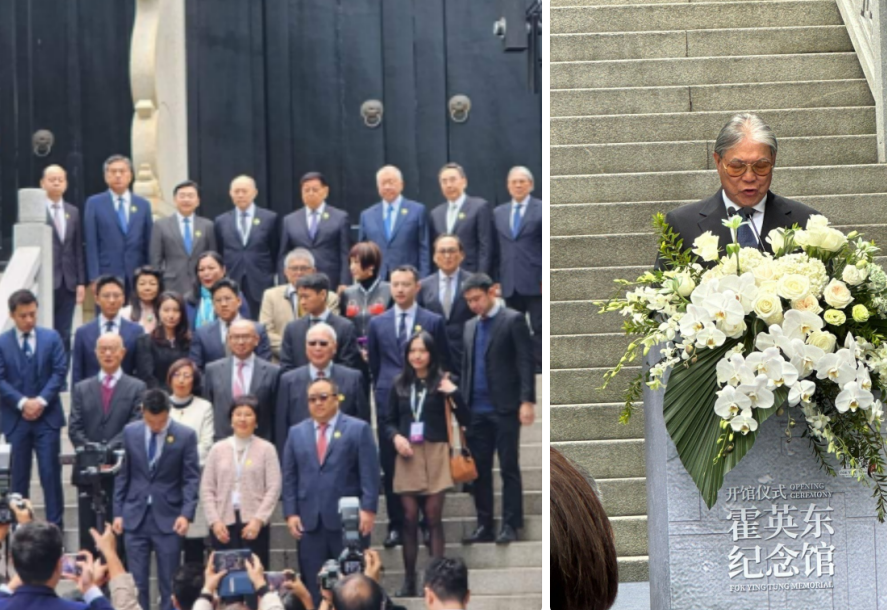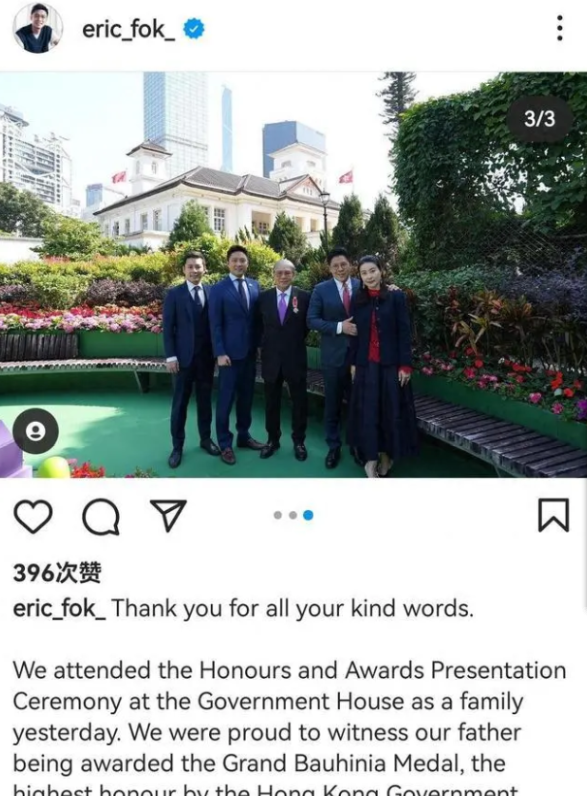 郭晶晶和霍家父子四人又合影,以霍英东孙媳妇的身份出席纪念馆开馆仪式,穿着黑色衣服