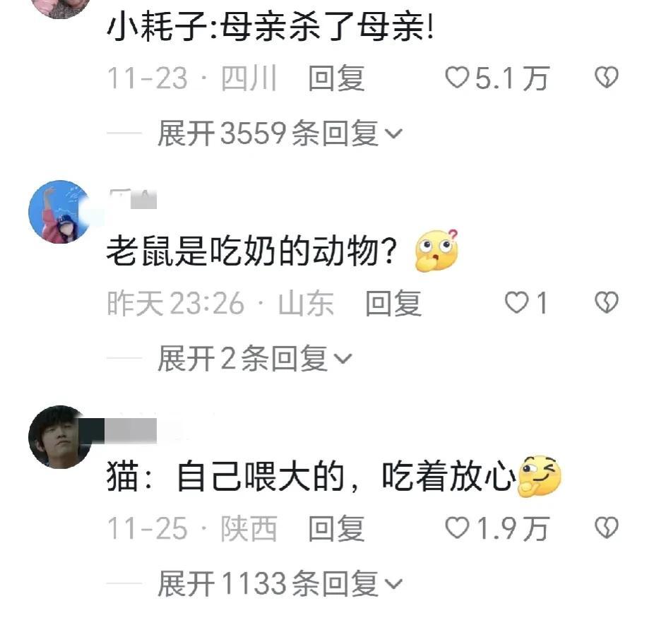 这样的猫你见过么?把鼠宝宝的妈妈吃了,然后给鼠宝宝喂奶养大它们,不是弄啥嘞?这只猫到底想的是什么?突然母爱泛滥,还是打算养大了吃? 网友:母亲杀了母亲,养母杀了生母。 网友:老鼠是吃奶的动物? 网友:自己喂大的,吃着放心。